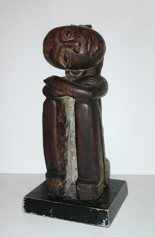 Large sitting wood sculpture with arms on knees and tilted headCollection