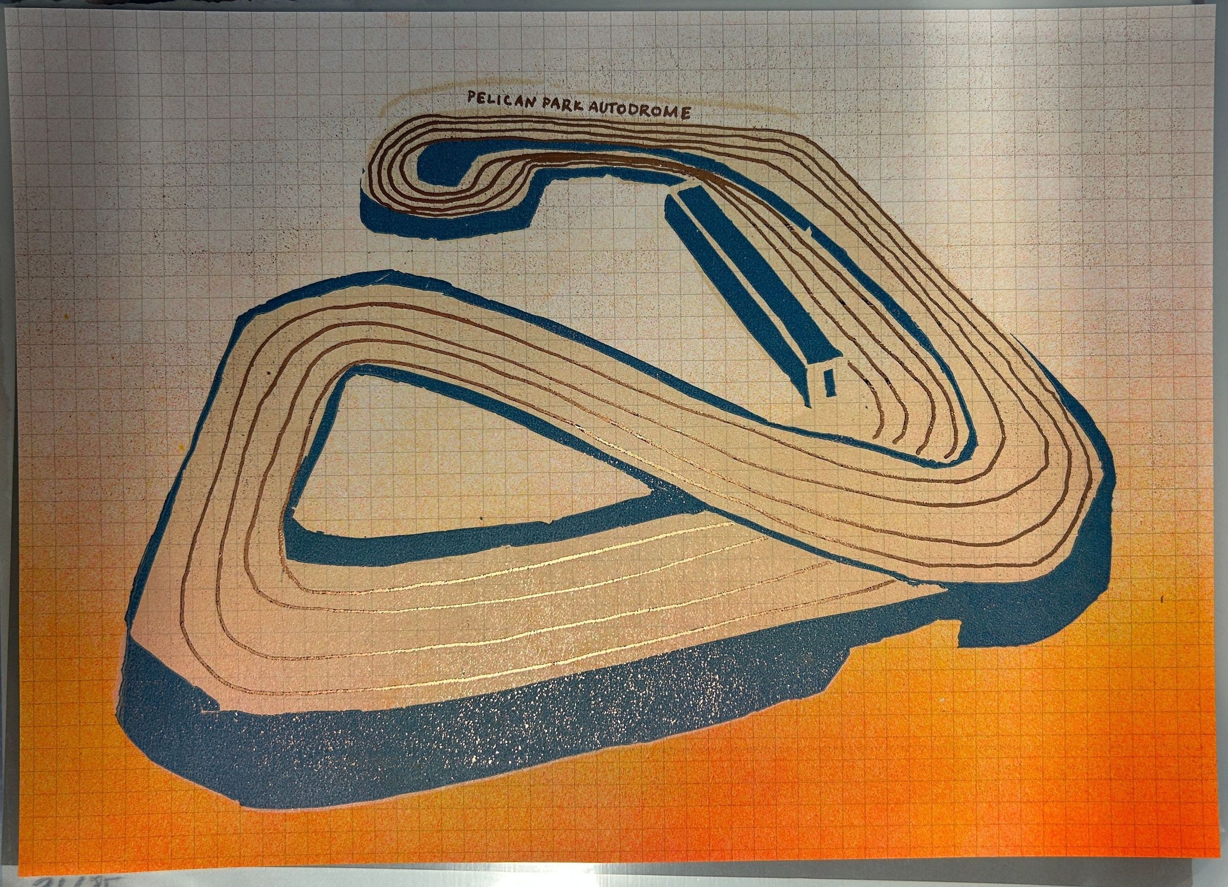 A small, colorful print of a racetrack the reads "Pelican Park Autodrome"Collection