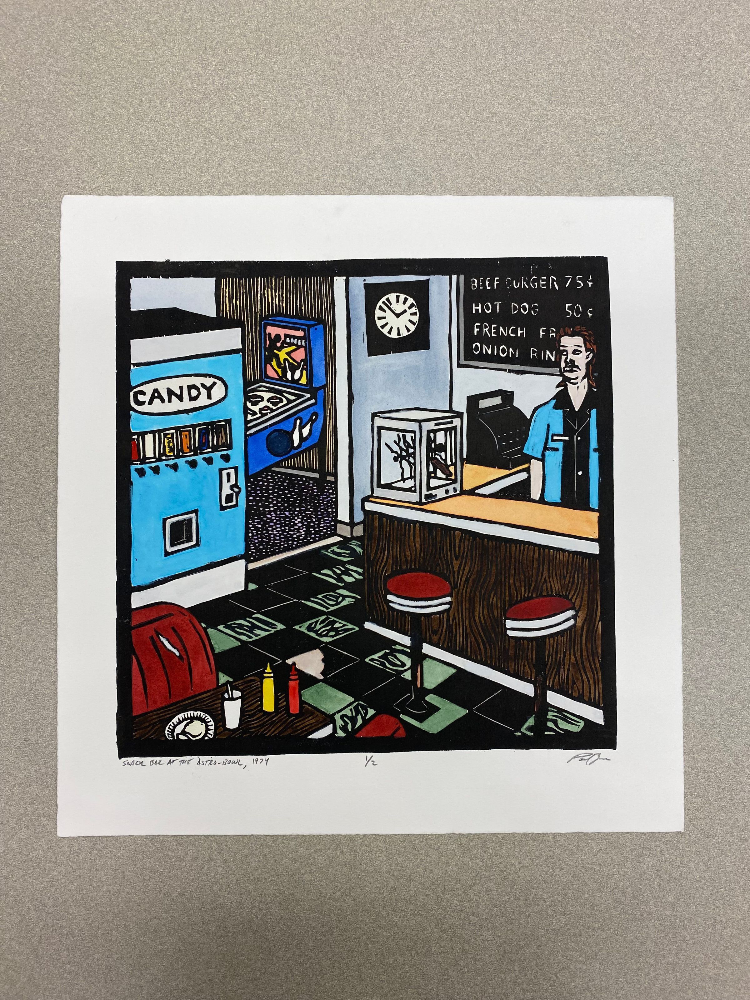 A medium vertically oriented print containing a scene of an entertainment store and snack bar with a masculine form behind service counter (on the right side) and staring off the the left. The room the view is in contains a booth and bar, and vending machine for candy. The side room contains a pinball arcade.Collection