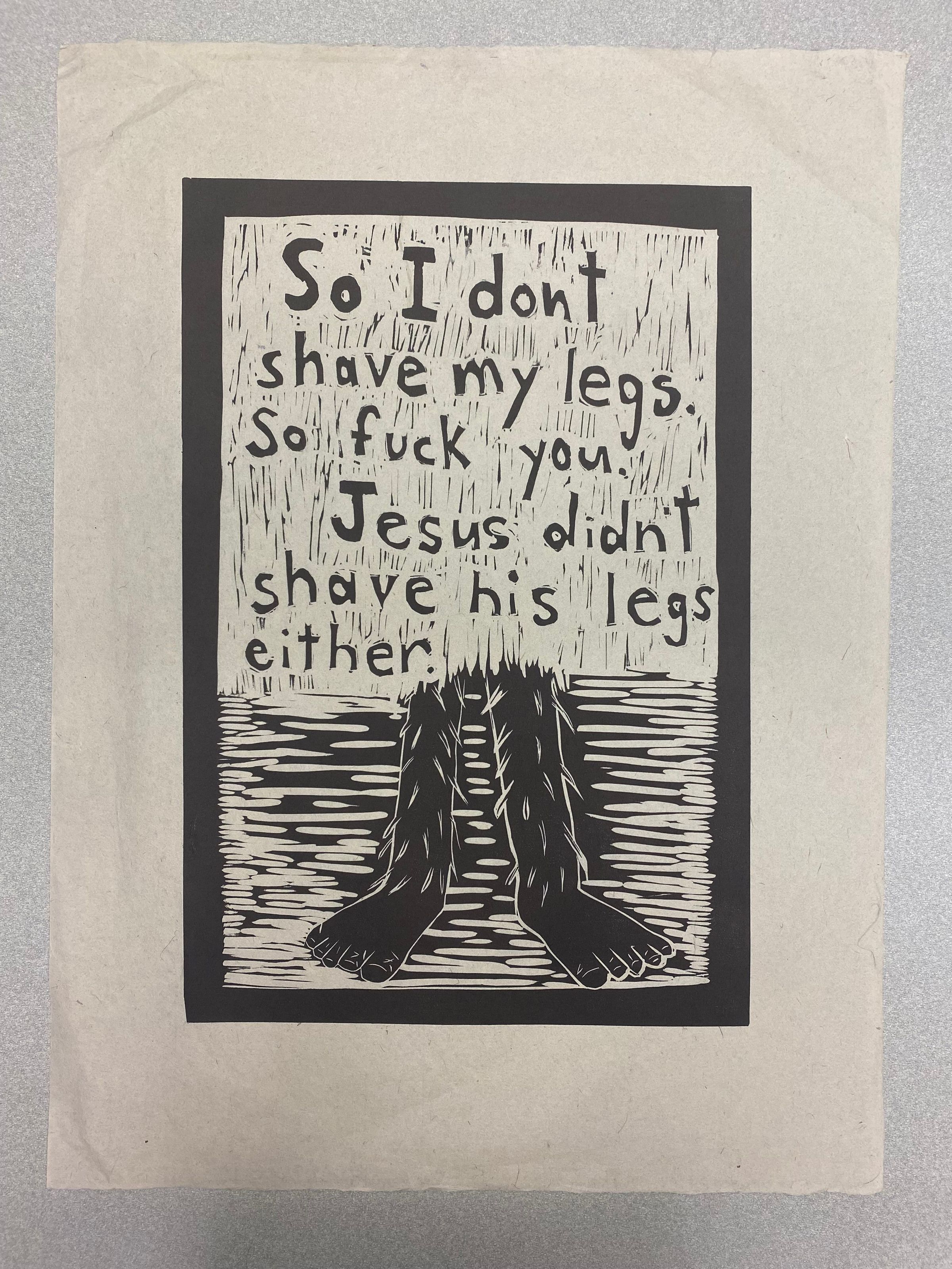 A large vertically oriented print of two hair legs occupying the bottom half of the composition while words float above the human form. The words portray social commentary while cut the legs bellow the knees.Collection