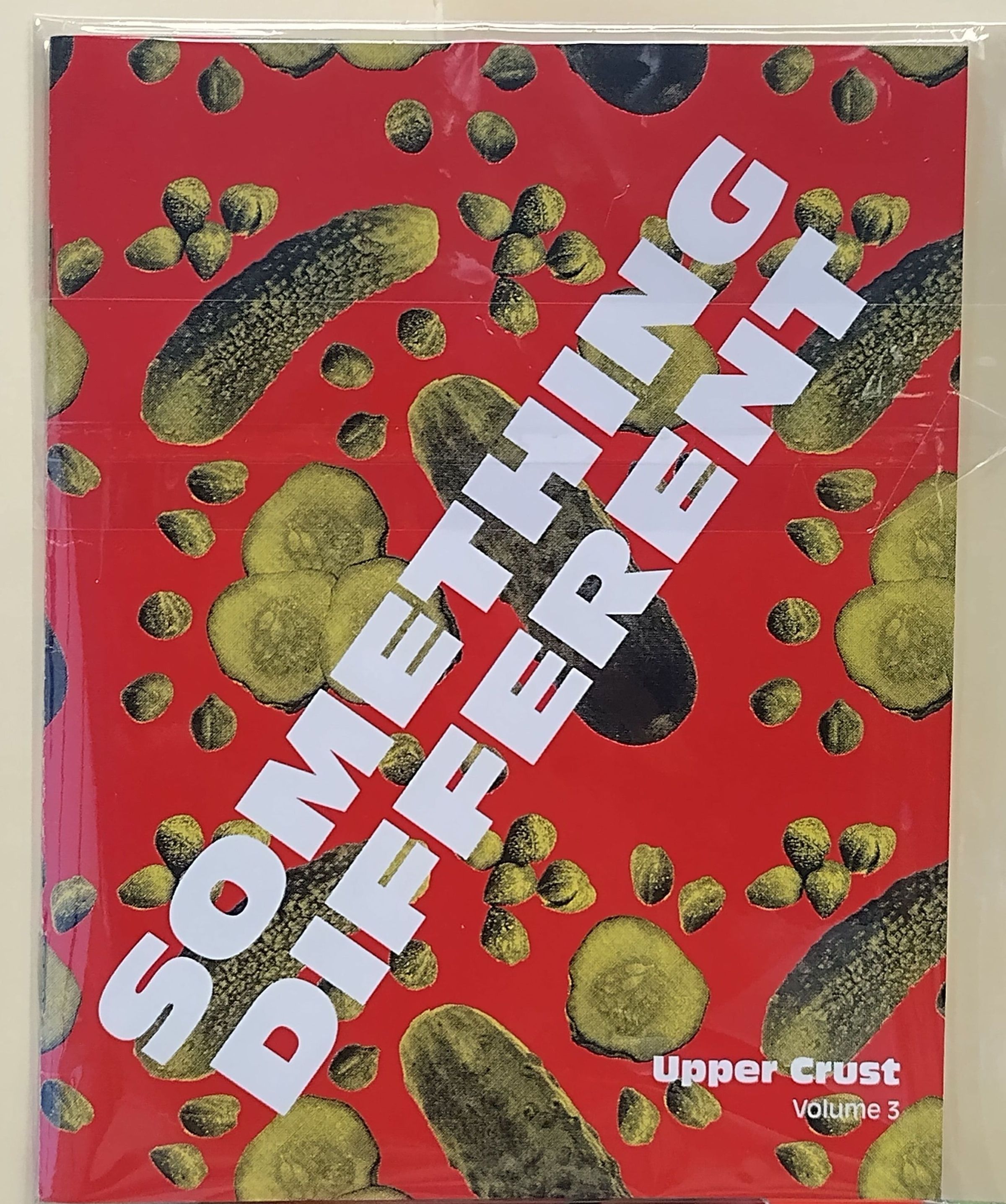 Small red paper booklet with white inner pages, with images of pickles in different forms scatted all around the covers. The title is located diagonally in the center of the front cover (lower left to top right), with the additional text on the lower right corner, all in white colored font.Collection