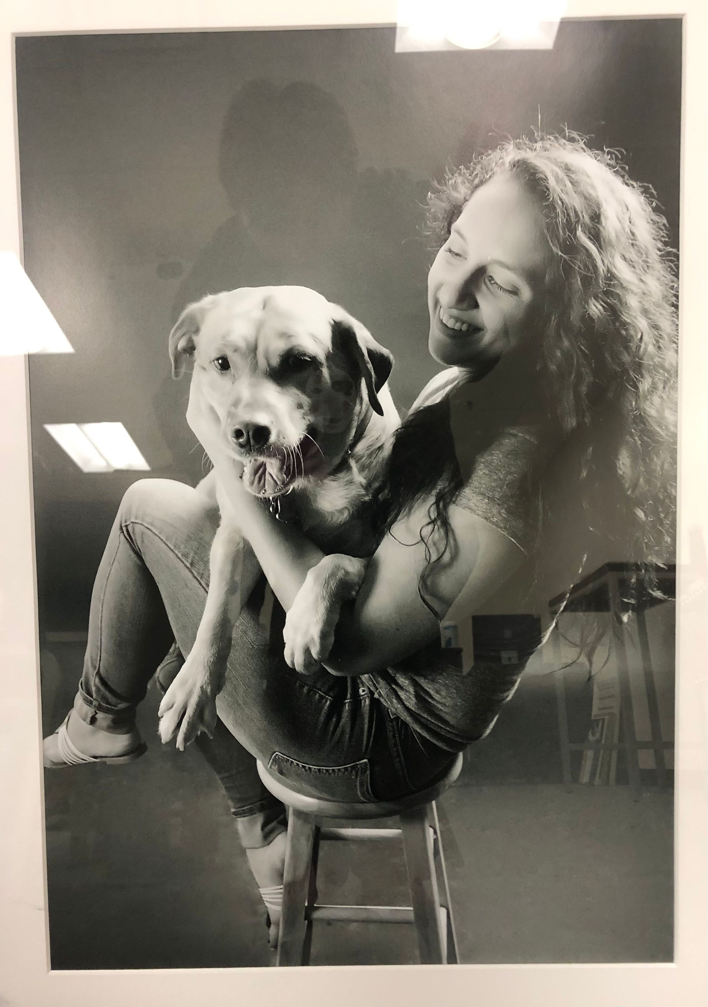 A medium-large photograph done in black and white. The image features woman seated in a v-shape position on a stool, smiling at a medium-sized dog in her lap.Collection