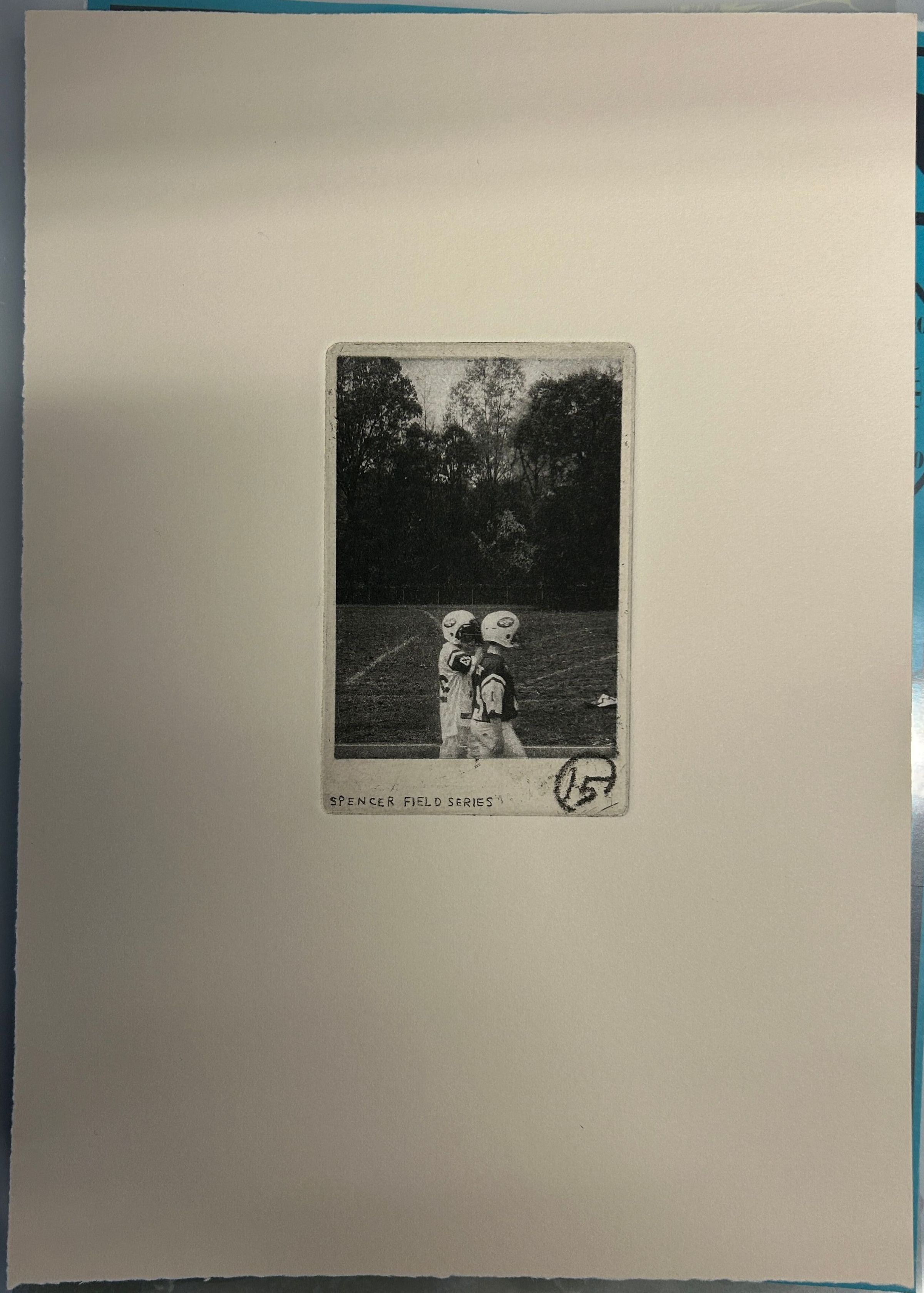 A small black and white print of a Polaroid of two football players walking in a field.Collection