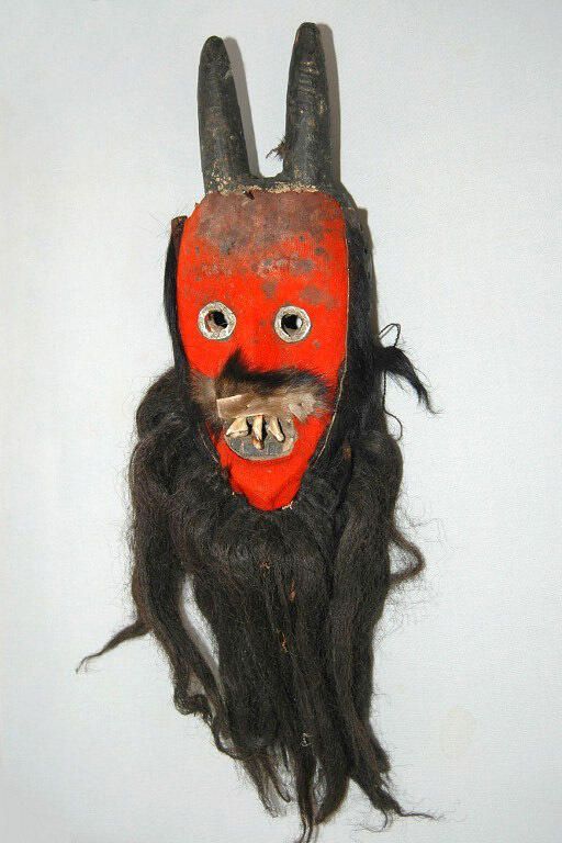Face mask with red pigment on the face, circular eyes, prominent teeth, conical horns, and with a long black hair beard and fur mustacheContext