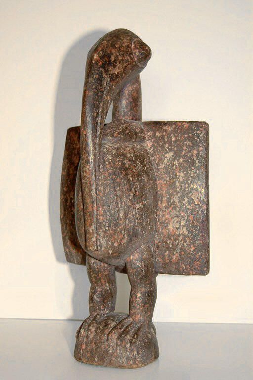 Standing bird sculpture with long bill extending to a protruding chest and with rectangular outstretched wingsCollection
