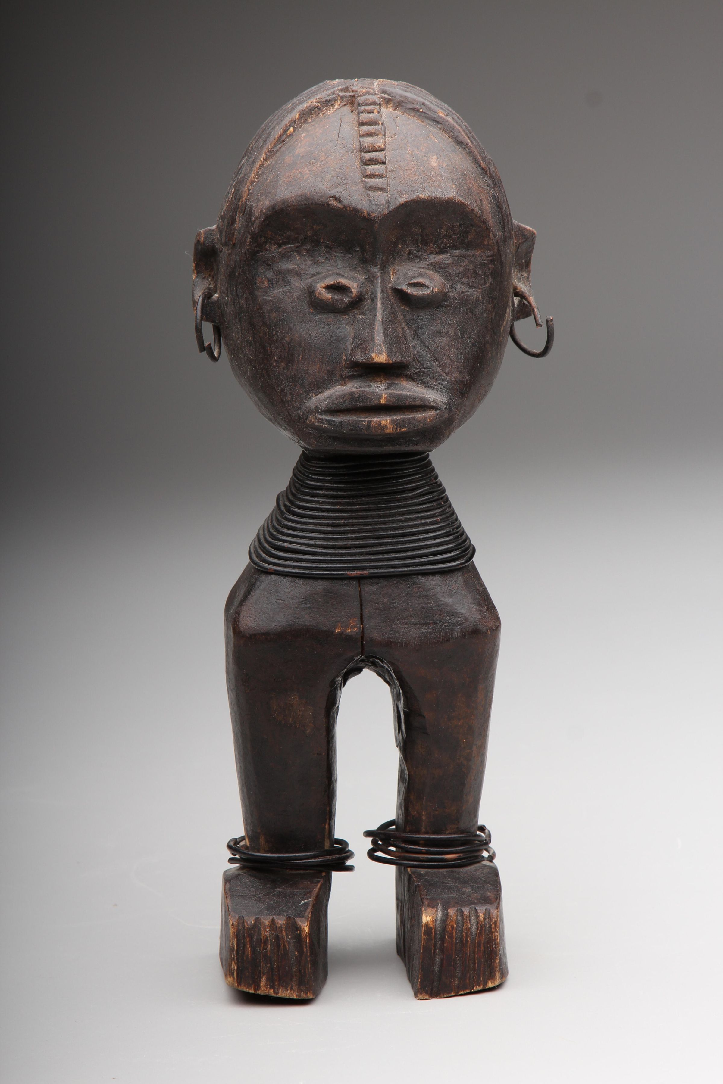 Small wood figure consisting of mainly head and legs, with metal ear rings, stacked metal necklace rings, and metal ankle rings.Collection