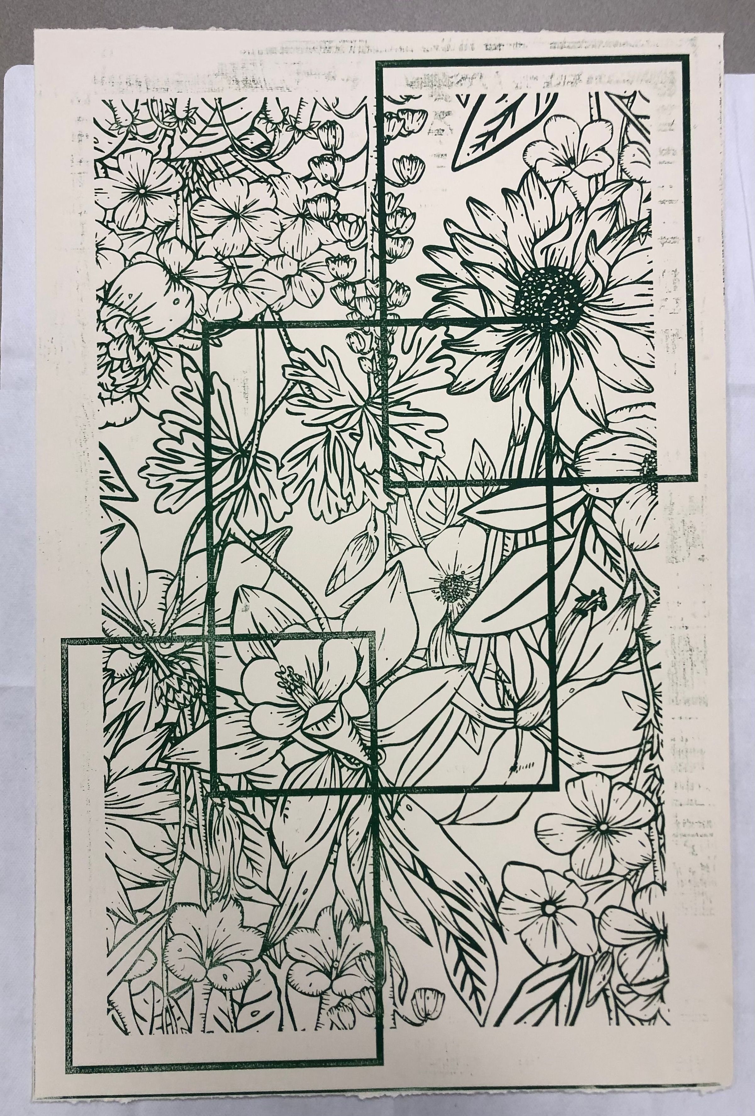 A large print in green ink on white print paper. The image depicts a background of various fauna, with three overlapping rectangles descending from the top right corner to the bottom left.Collection