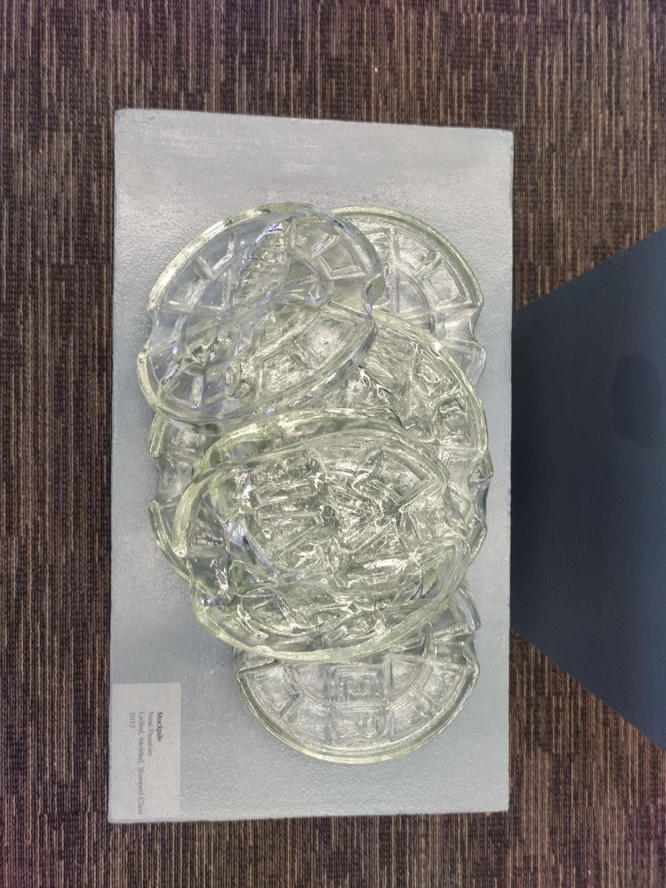 Collection of seven molded clear glass pieces piled together with the word "WATER" across each. Series or trapezoids and triangle form a pattern on the surface.Collection