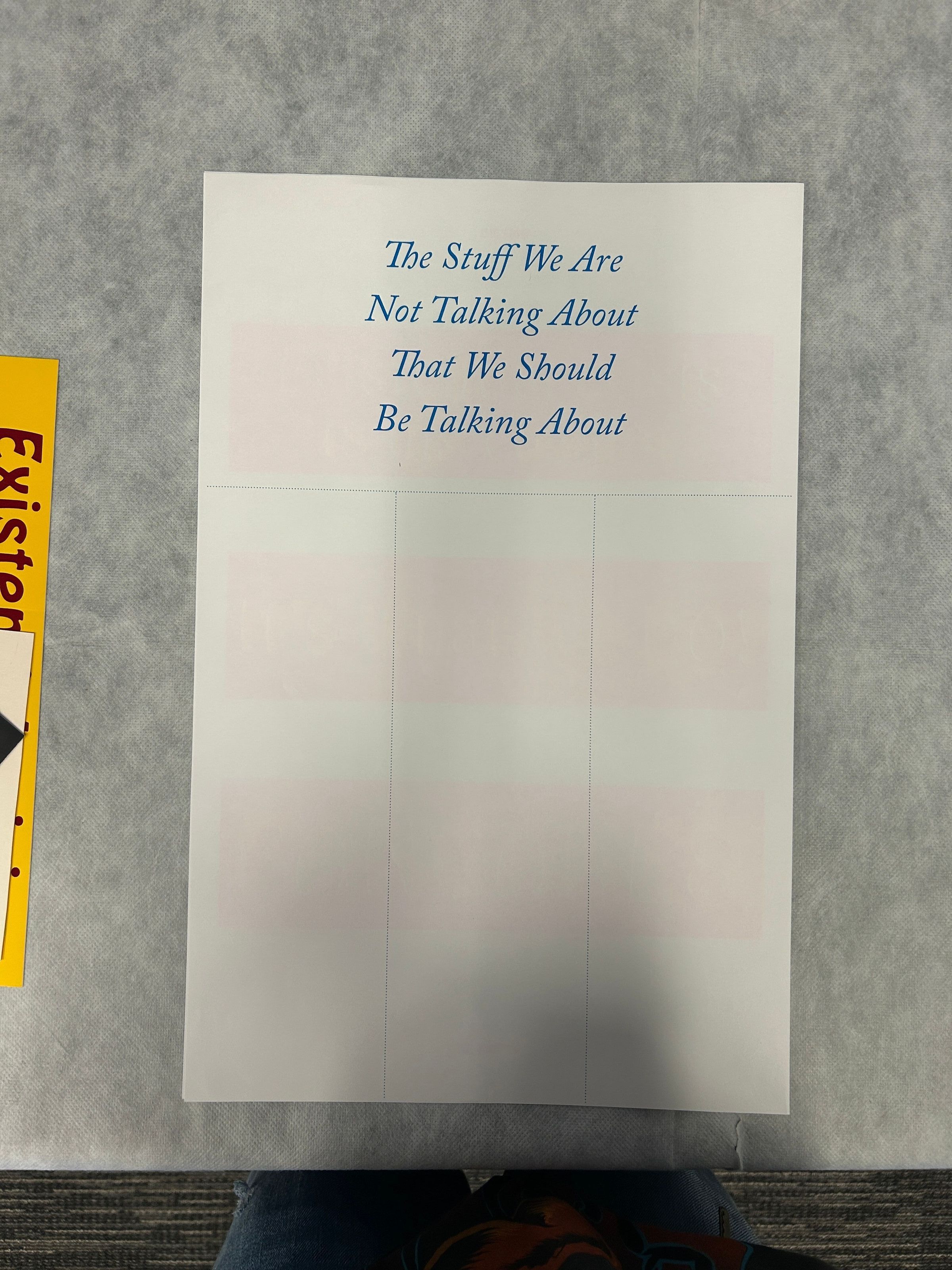 A white and blue print with a table including three sections labled "The Stuff We Are Not Talking About That We Should Be Talking About"Collection