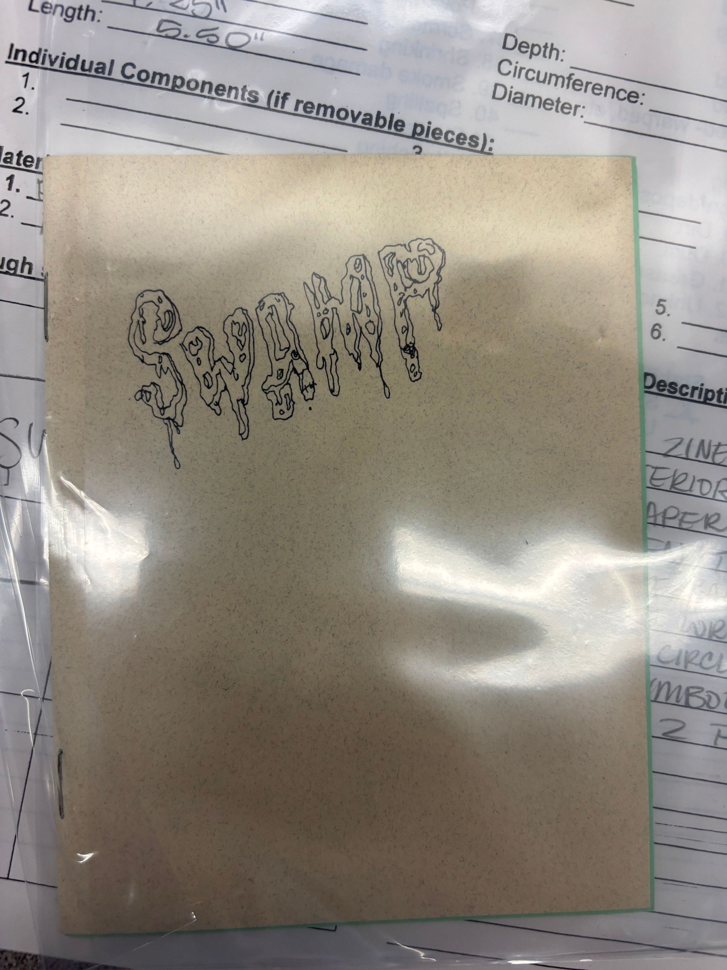 The cover is unbleached/brown paper with the word "Swamp" on the front in watery letters. The interior pages are on green paper with eight lines of text that are handwritten on both sides of the page. The back cover is the author's name and the year of publication with the copywrite symbol.Collection