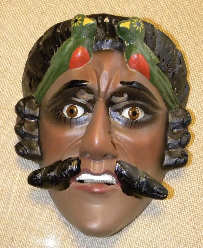 A long diamond face-shaped wood mask depicting a man with a walnut brown complexion and blush accents on cheeks and nose. The mask has curly black carved hair that leads into sideburns. The hair is decorated with two green birds. There are two inset glass light brown eyes with black eyelashes beneath and black shading around the eyes. The cutout eyeholes for the wearer are under black eyebrows. The mouth is parted with grape-purple lips and white teeth. A parted black mustache is under a hooked nose. Incised lines on the forehead and mouth depict a concerned expression. A copper wire is attached to the back of the mask.Context