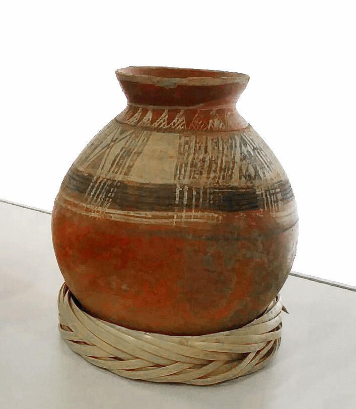 Small round terracotta vessel with flared opening and incised, pigmented design around upper half of vessel.Collection