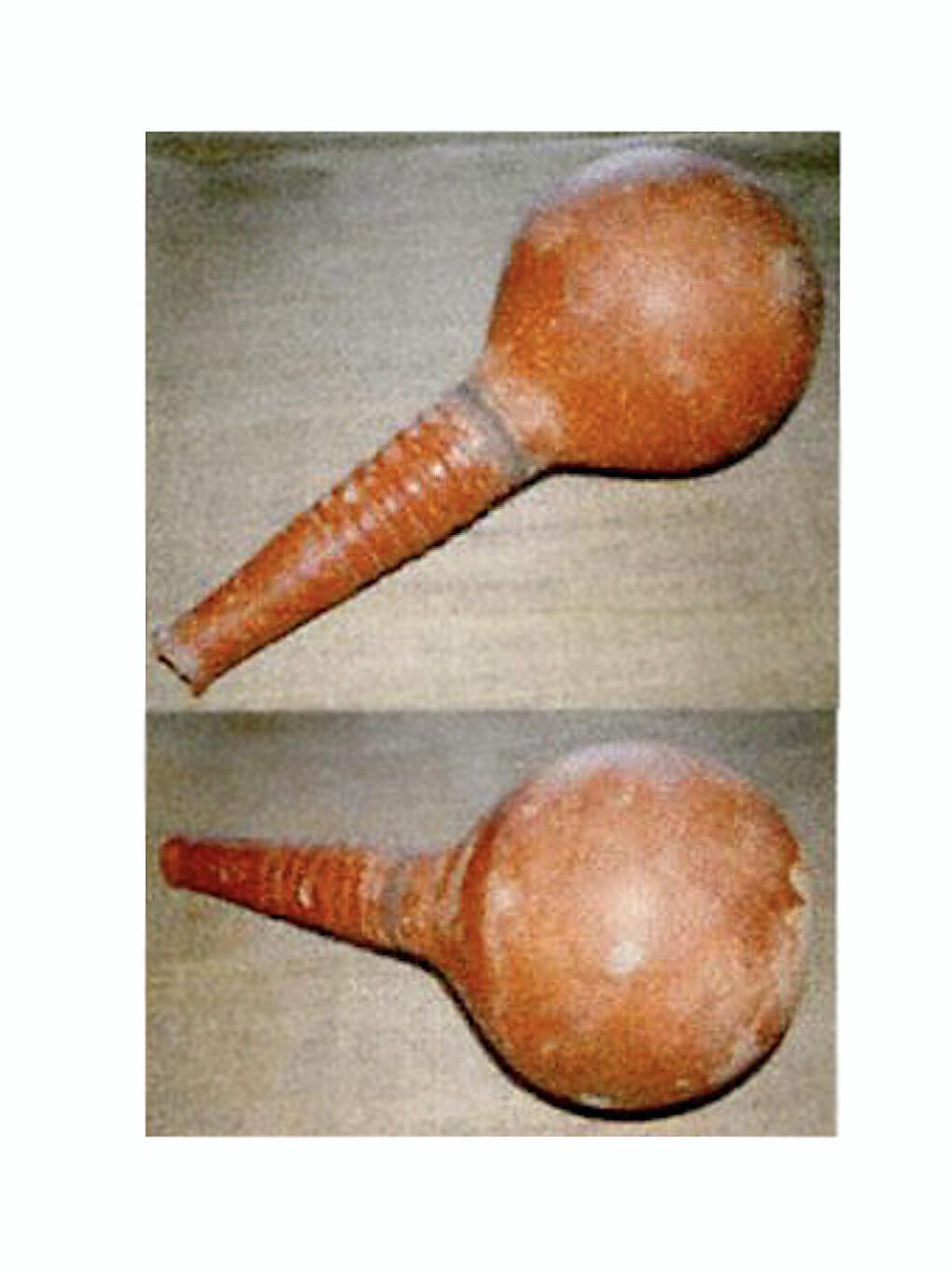 Medium sized, round-bottom, pigmented terracotta vessel with long, conical ringed neck.Collection