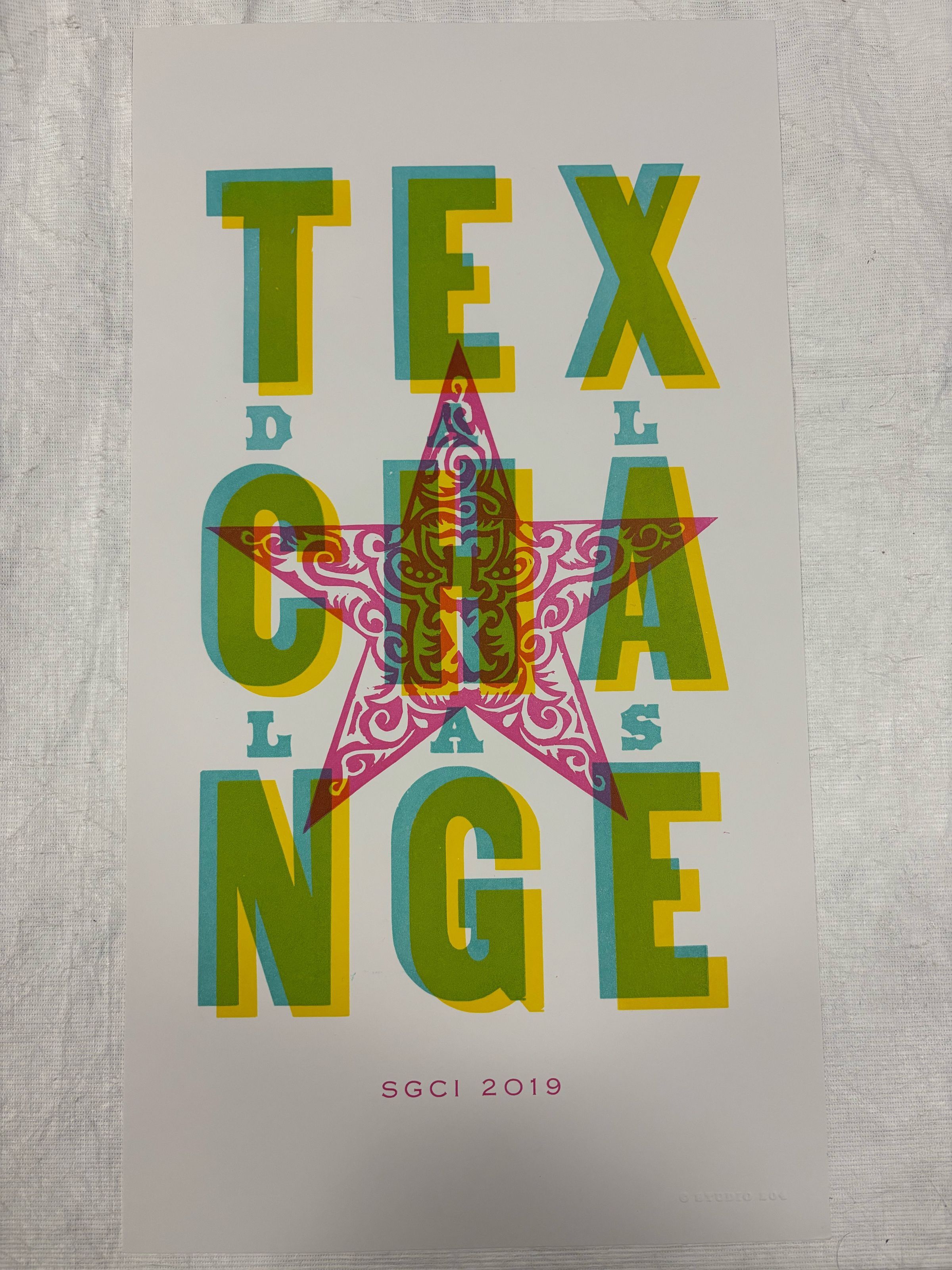 Medium, rectangular, vertically-oriented print with the letters of "Tex Change" lined in three rows in overlapping teal and yellow to create green. "Dallas" is spaced in between in a smaller teal font. At the center is a magenta star with swirl patterns and "TX" in the center.Context