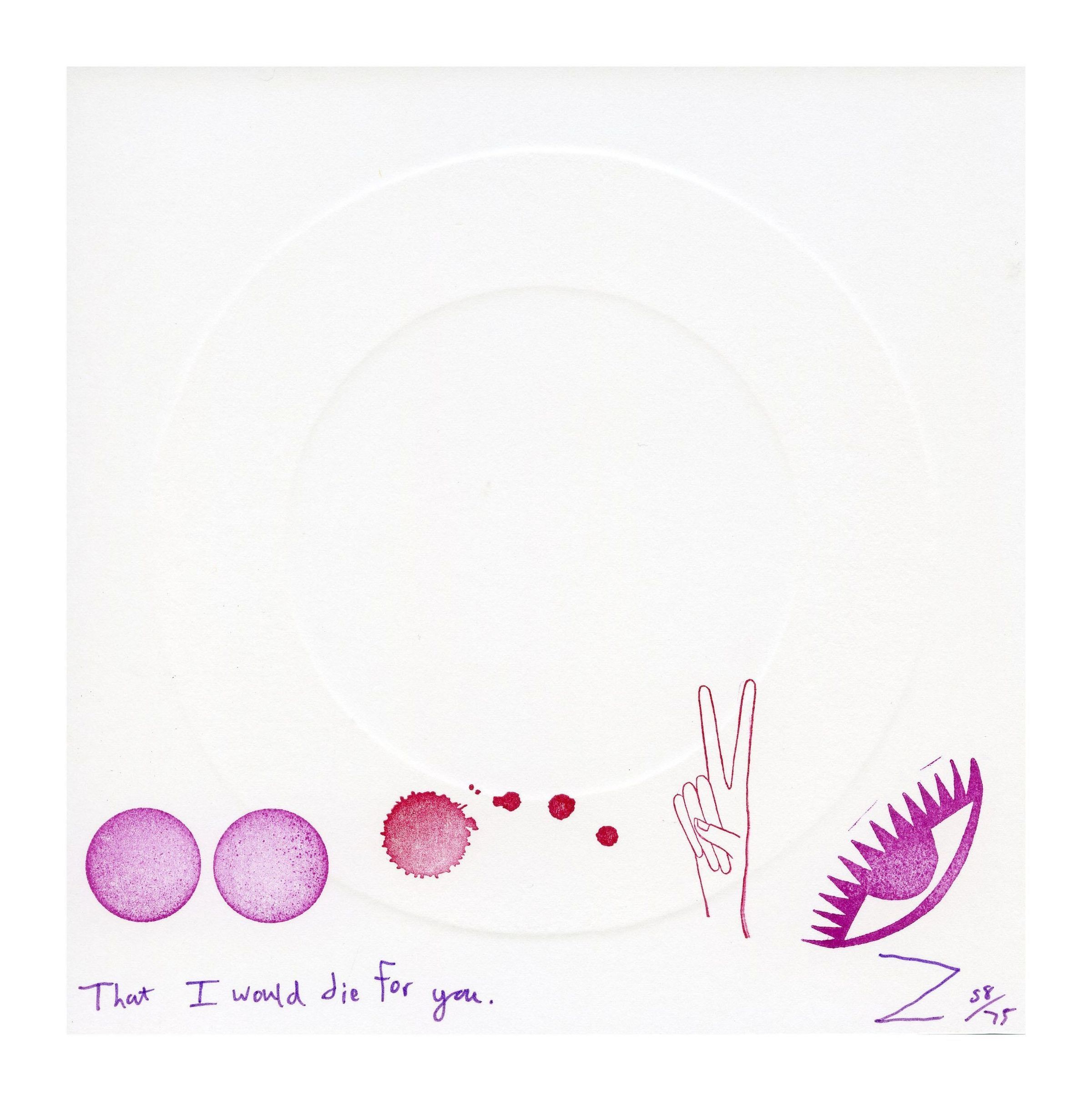Single small white squared paper with two pink circles on the bottom left corner, followed by a splatter of red paint with 3 dots following. A line art of a hand holding a peace-sign (two fingers) and a diagonal pink eye are located on the bottom right corner. Beneath the line of images is the title in purple handwritten letters on the left and a "Z" with the edition number on the bottom right corner beneath the eye. A large embossed circle can be seen in the center.Collection
