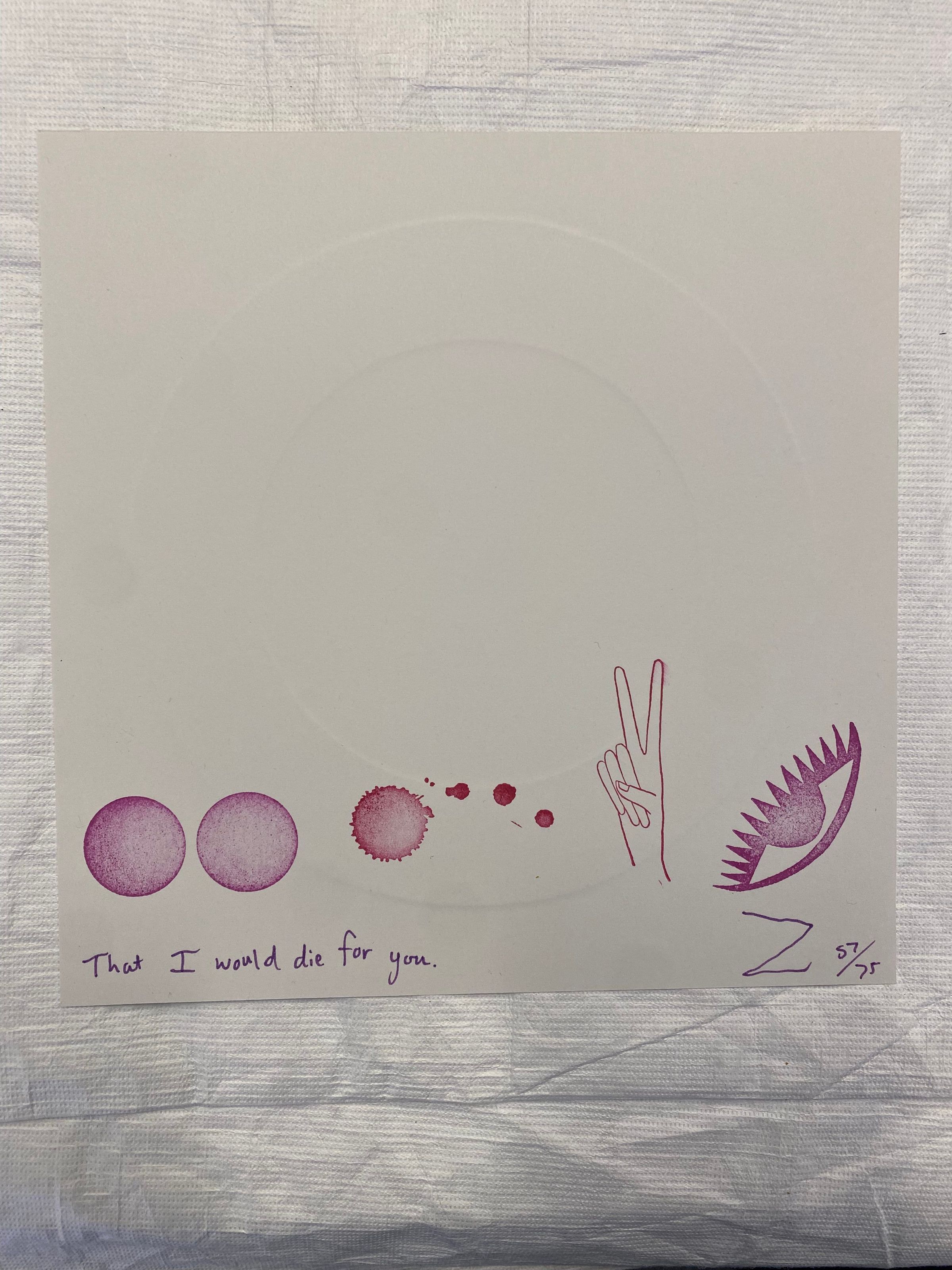 Small square print embossed with a central linear circle with symbols printed across the bottom. Two solid circles, one circular splatter, a linear hand holding up two fingers depicting a peace sign, and an eye with triangular lashes on top.Collection