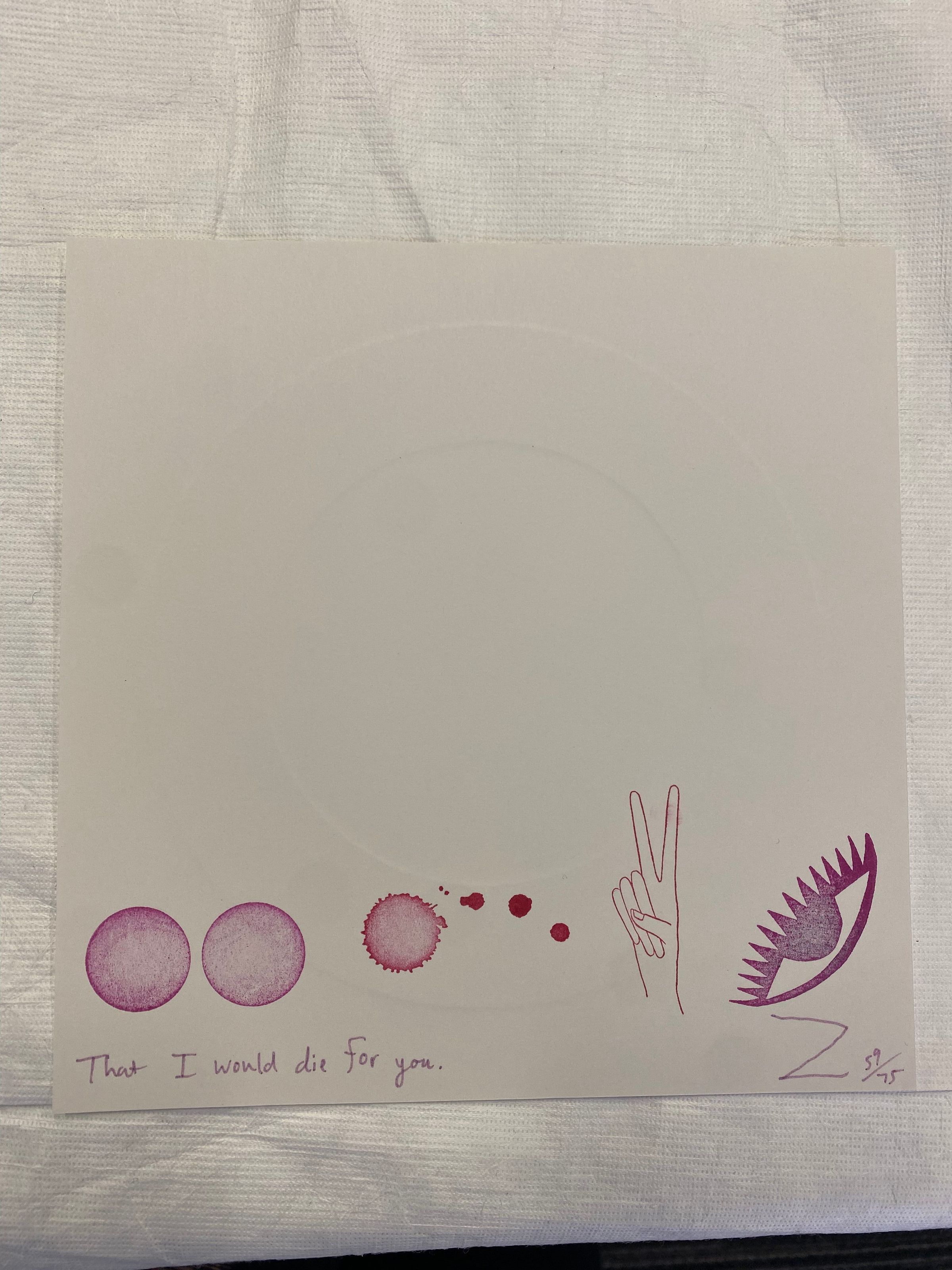 Small square print embossed with a central linear circle with symbols printed across the bottom. Two solid circles, one circular splatter, a linear hand holding up two fingers depicting a peace sign, and an eye with triangular lashes on top.Collection