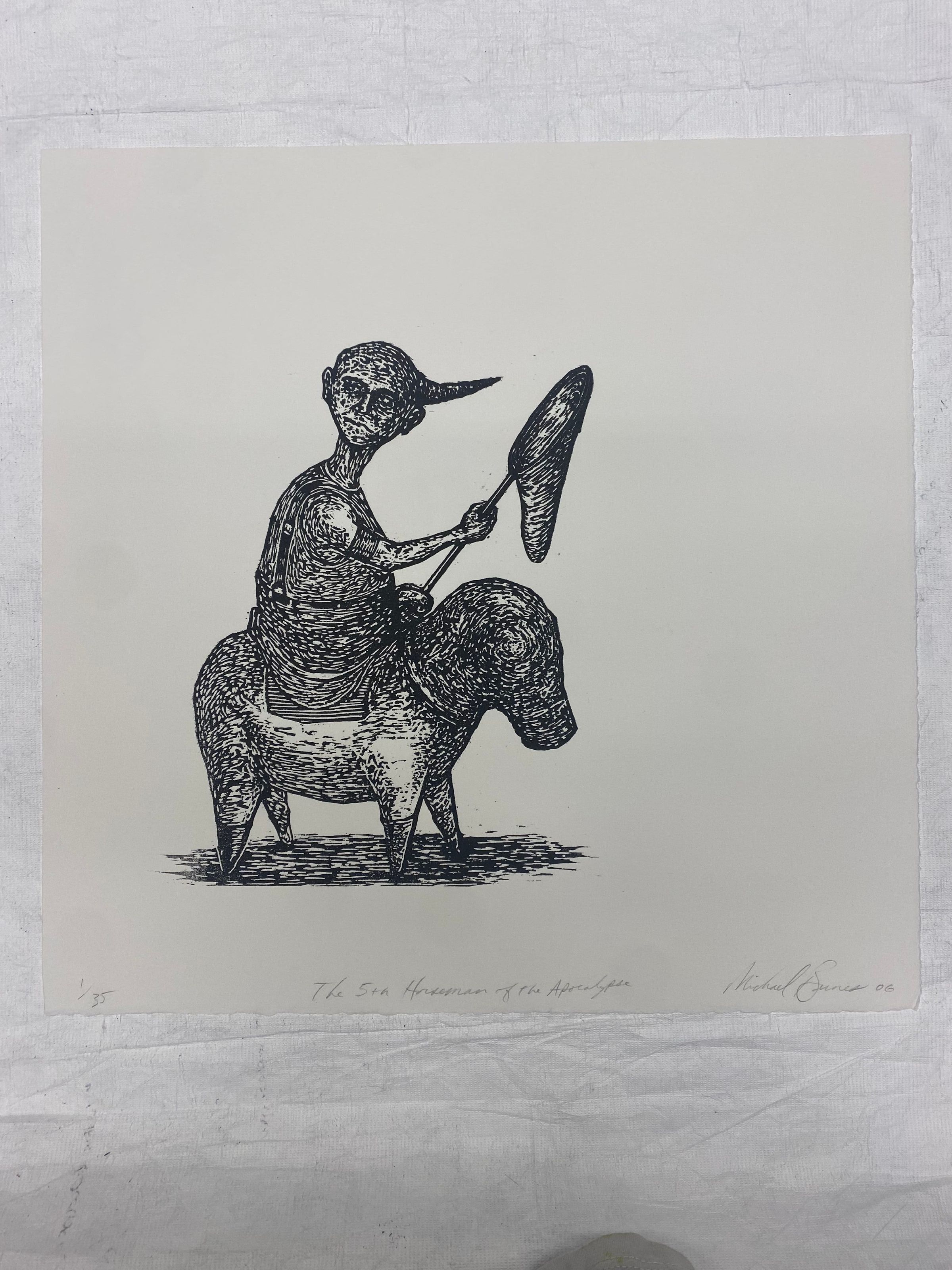 Medium-sized square relief print of a figure looking over its right shoulder while holding a net on top of a four-legged faceless equestrian creature. Figures are both made up of repeated incised lines with strong white highlights in the center.Collection