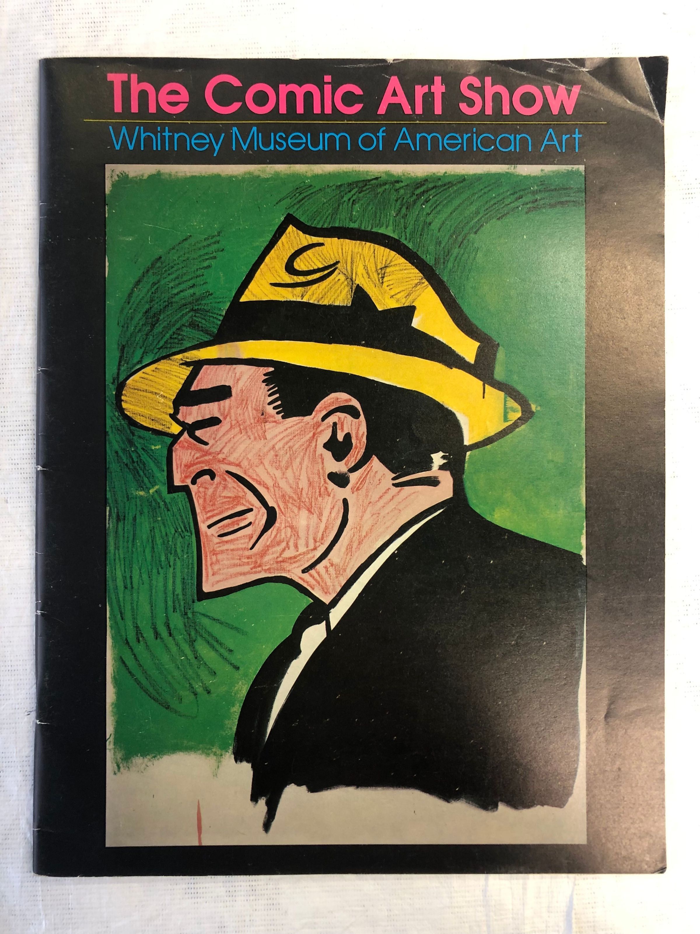 A medium sized, thin black book with the title at the central top in pink and blue, an illustration of Dick Tracy against a green background below. The interior contains an exhibition catalogue with context to the cartoons and their illustrators, the images in black and white.Collection