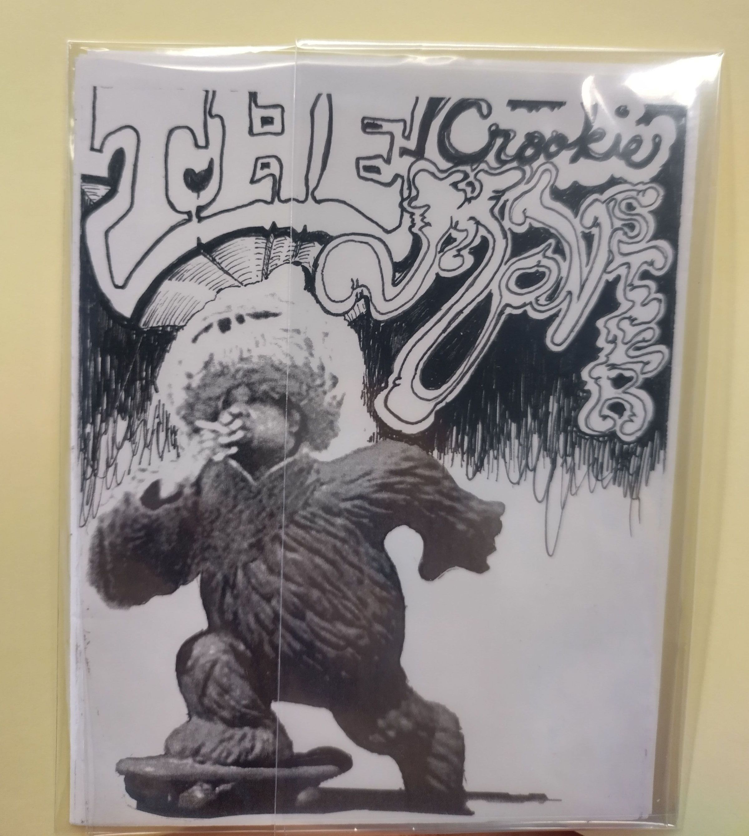 Small black and white paper booklet with a photocopy image of a man in furry monster suit, smoking on a skateboard. Above the man is the title printed in different fonts with a black background that fades halfway into looping sketch lines. On the center of the back cover is a black spot with text around it and the edition (left) and author signature (right) written on the bottom corners.Collection