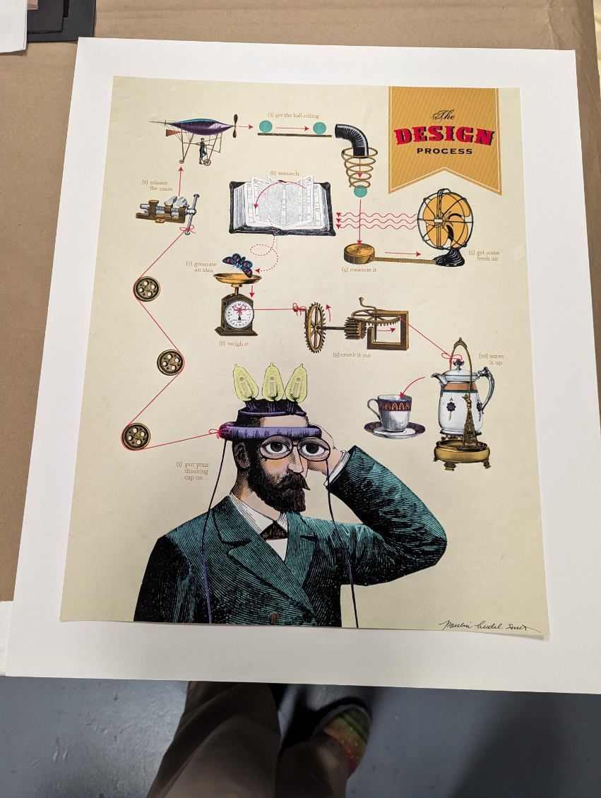 A medium sized poster using illustrations to represent the process of design leading to an illustration of a man at the center bottom.Collection