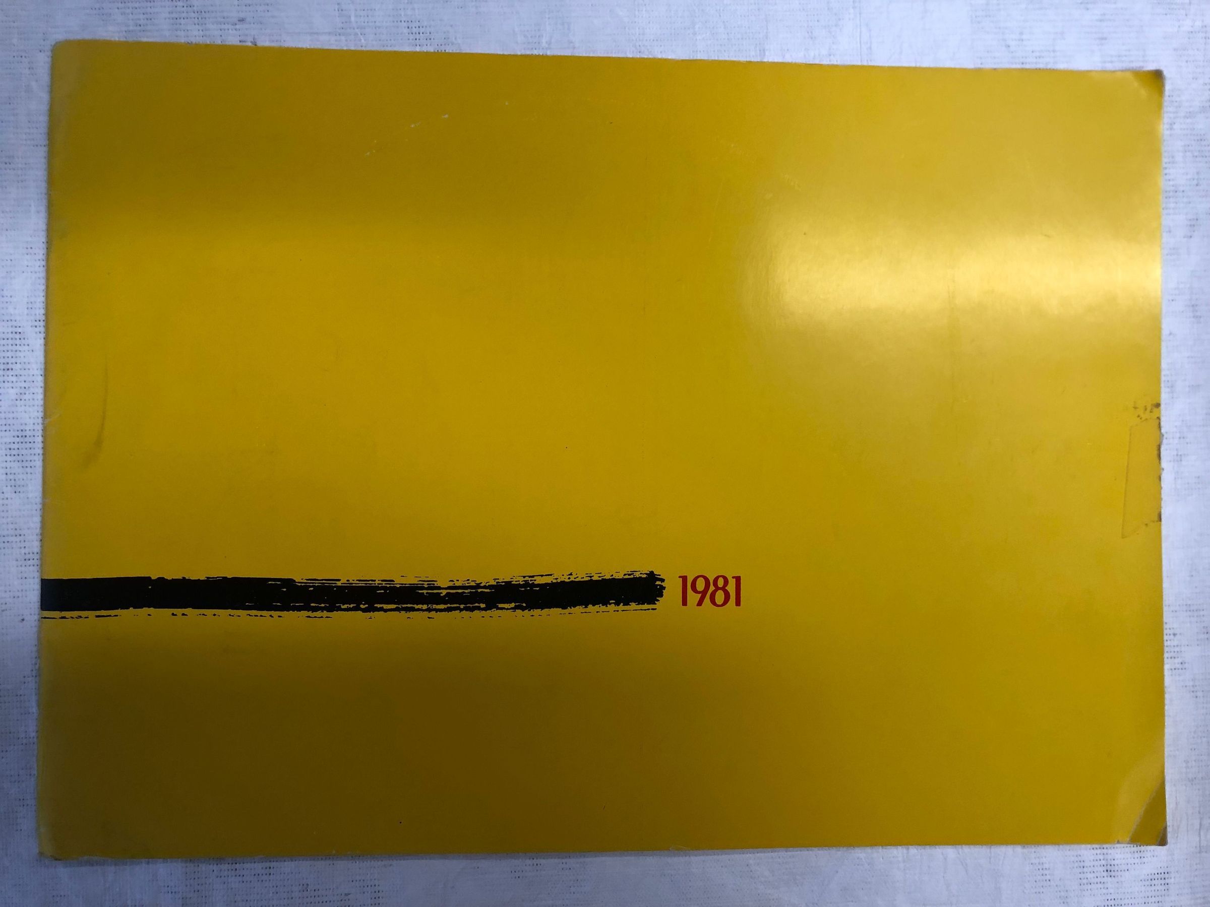 A medium-large, thin, yellow book with a black streak mark in the central lower left towards the center, with the date 1981 to its right in red on the front cover. The interior contains an exhibition catalogue, introducing the mission of the exhibition and its artists, the images in black and white.Collection