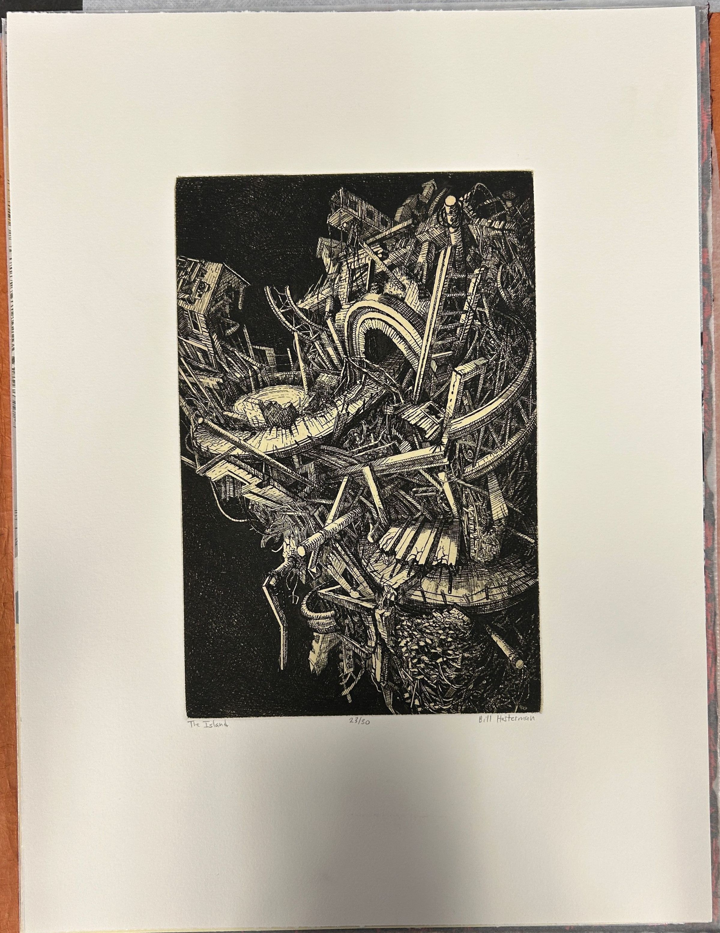 A large print of a dilapidated building built out of an amalgamation of wood planks, ladders, pipes, wires, etc.Collection