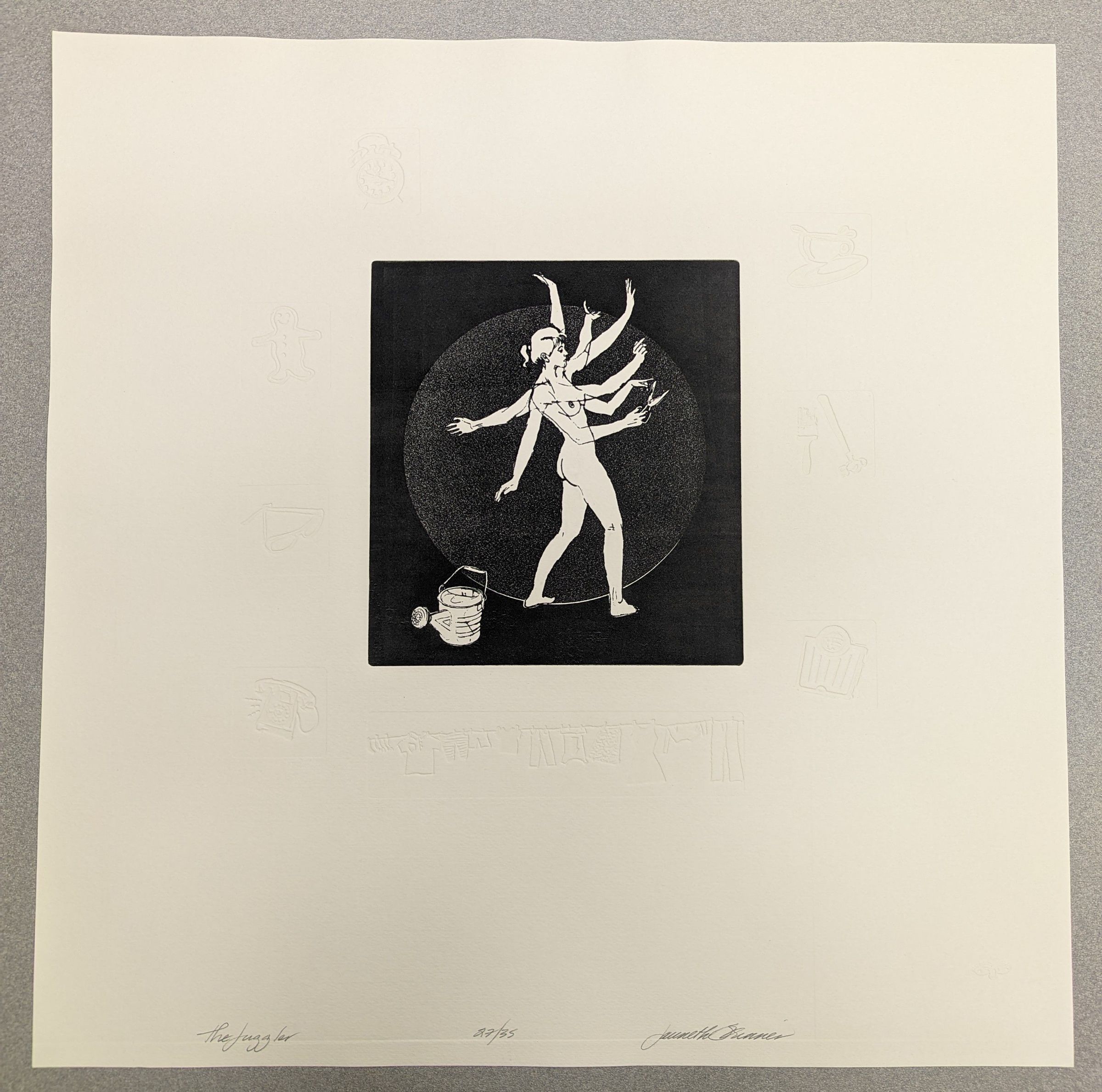 A small, square-shaped print in the center of a larger piece of cotton rag paper. It shows a nude woman with her hair tied back and her arms in a variety of poses, interposed on top of each other: reaching out, reaching down, holding, patting, etc. Next to her is a gardener's watering can. The background is completely black, although a circle directly behind her, from her foot to her up-stretched wrist, is a gradient with gray. Around the central plate is the indented impression of a variety of household tools and objects: an alarm clock, a teacup, a hammer and brush, a scale, laundry, a phone, glasses, and a gingerbread man cookie.Context