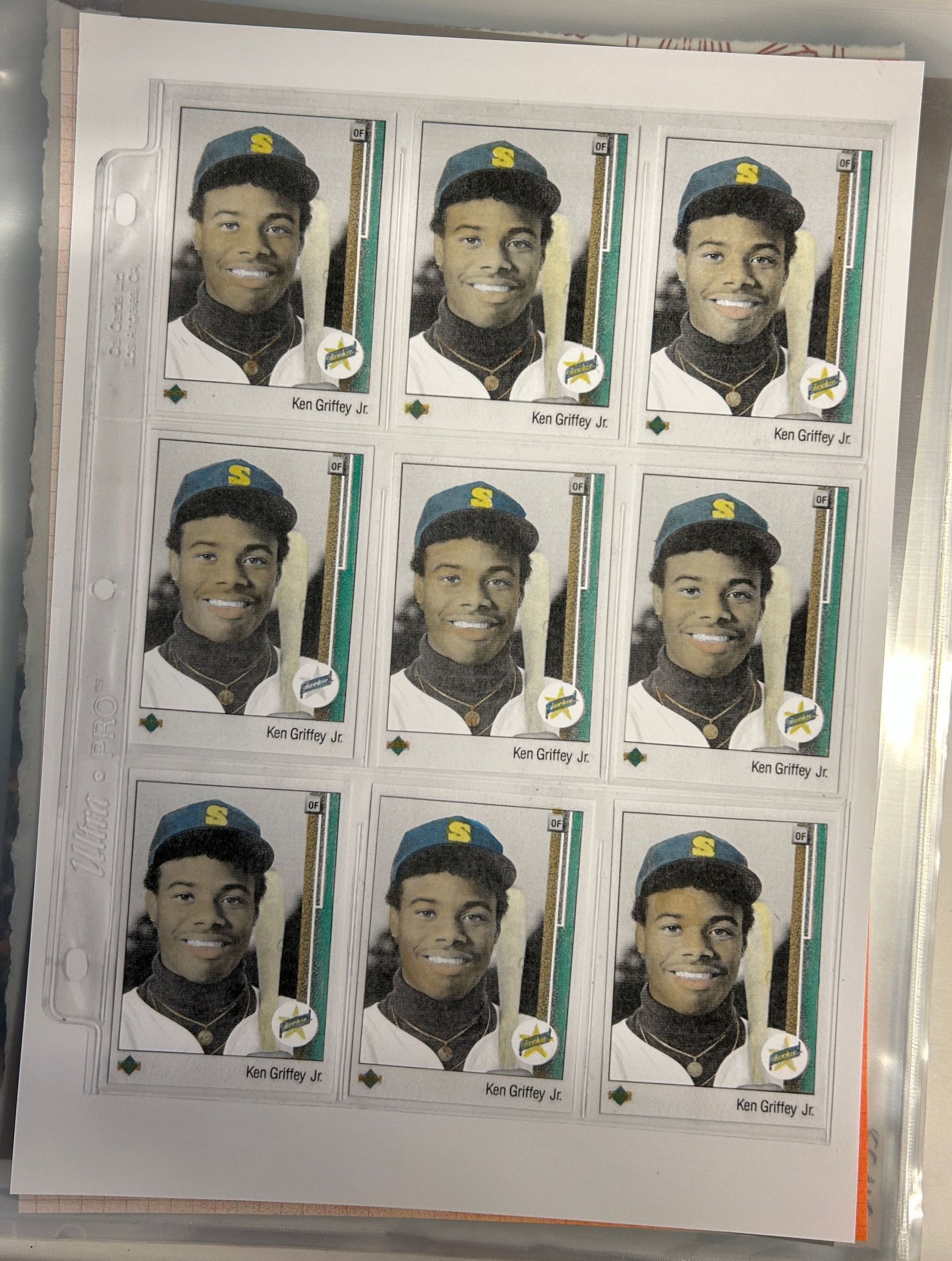 A colorful print of Ken Griffey Junior's Baseball cards arranged in three rows and columns.Collection