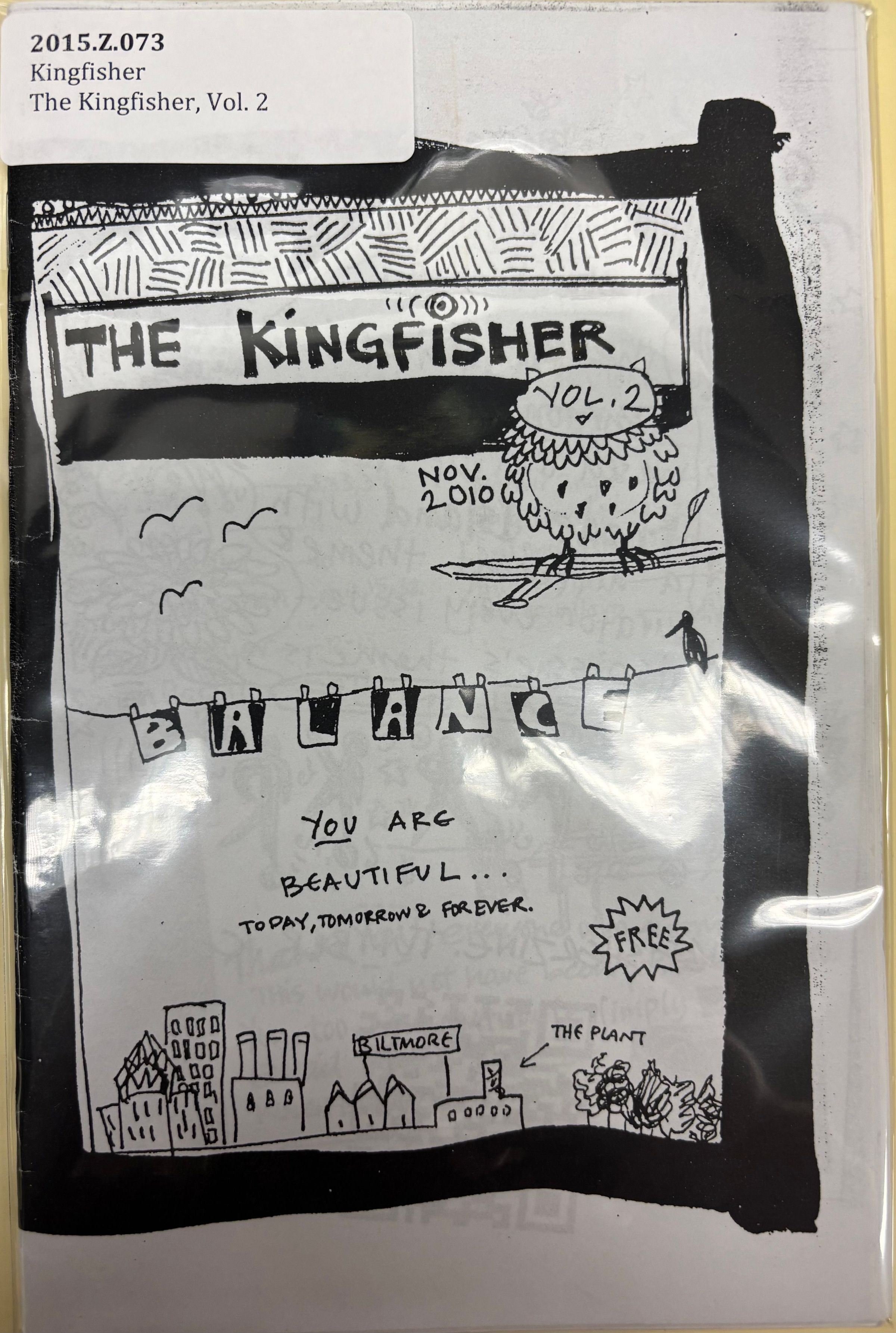 The front cover is a black and white print depicting a place called Biltmore with the word balance hanging from a clothesline. There is an owl on a tree branch next to the title at the top.Collection