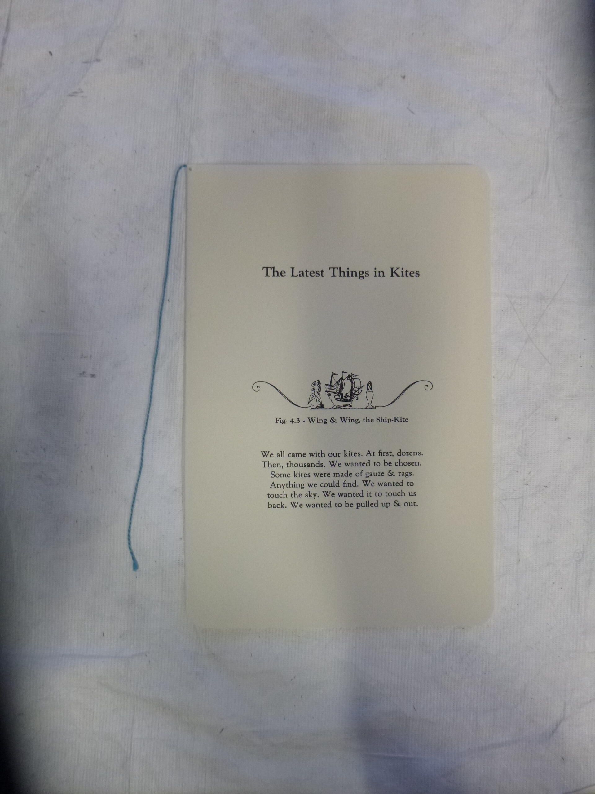 A two-page vertically oriented letterpress book in black pigment on cream-colored paper with a light blue string attached to spine; edition 849/1000.Collection