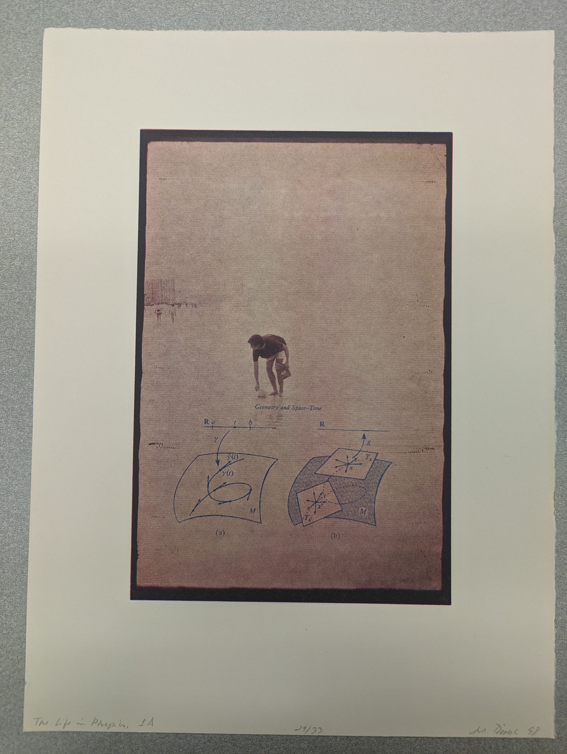 A vertical print showing a photograph of a man bending down in a pale background with people in the distant background. Below him are diagrams titled "Geometry and Space-Time."Context
