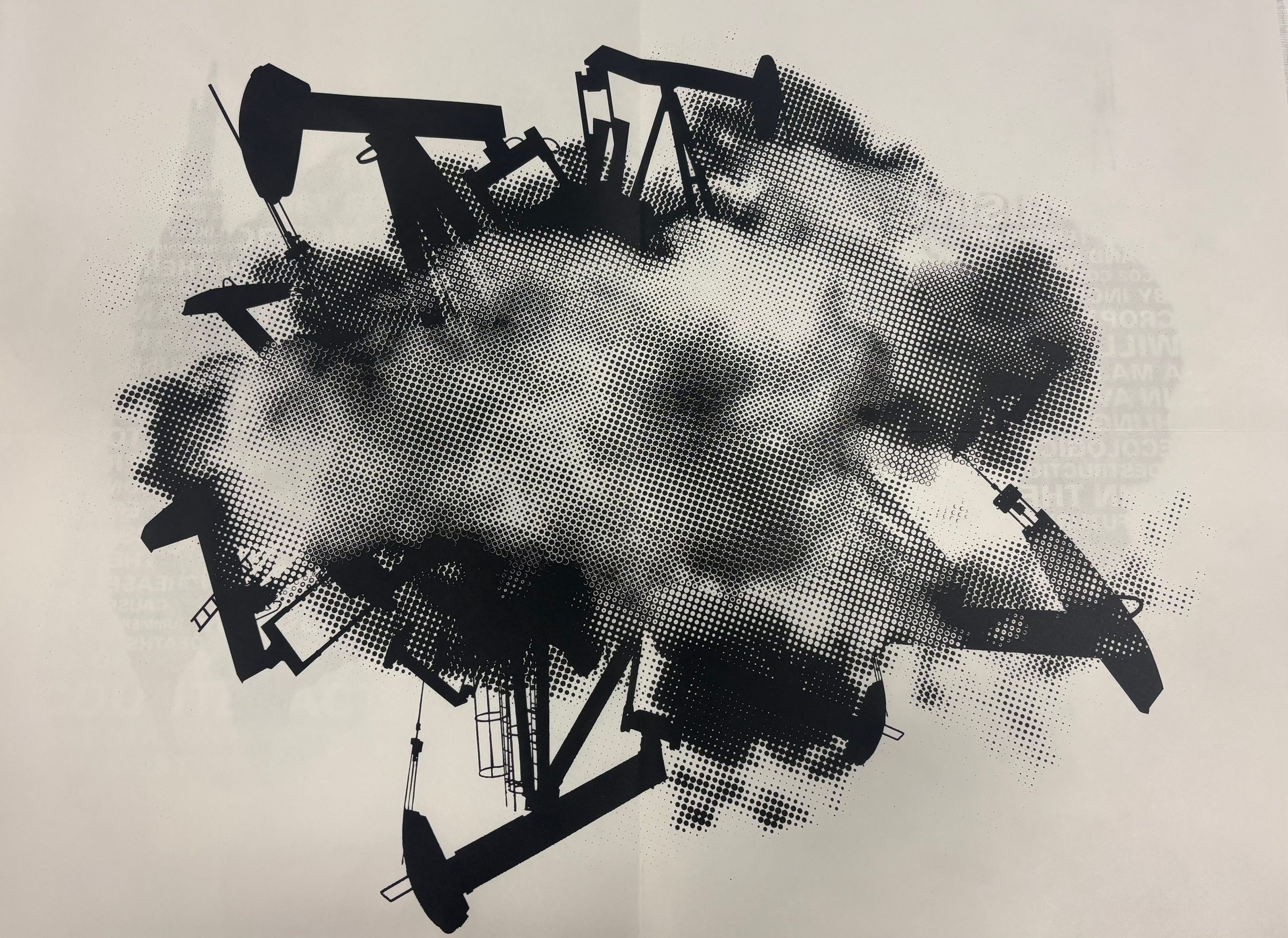 Large, rectangular, horizontally-oriented, black and white print with two pages folded in half. The image inside is of oil drilling rigs within a dark cloud made up of dots. Other spread pages include text about climate and industry materials.Context