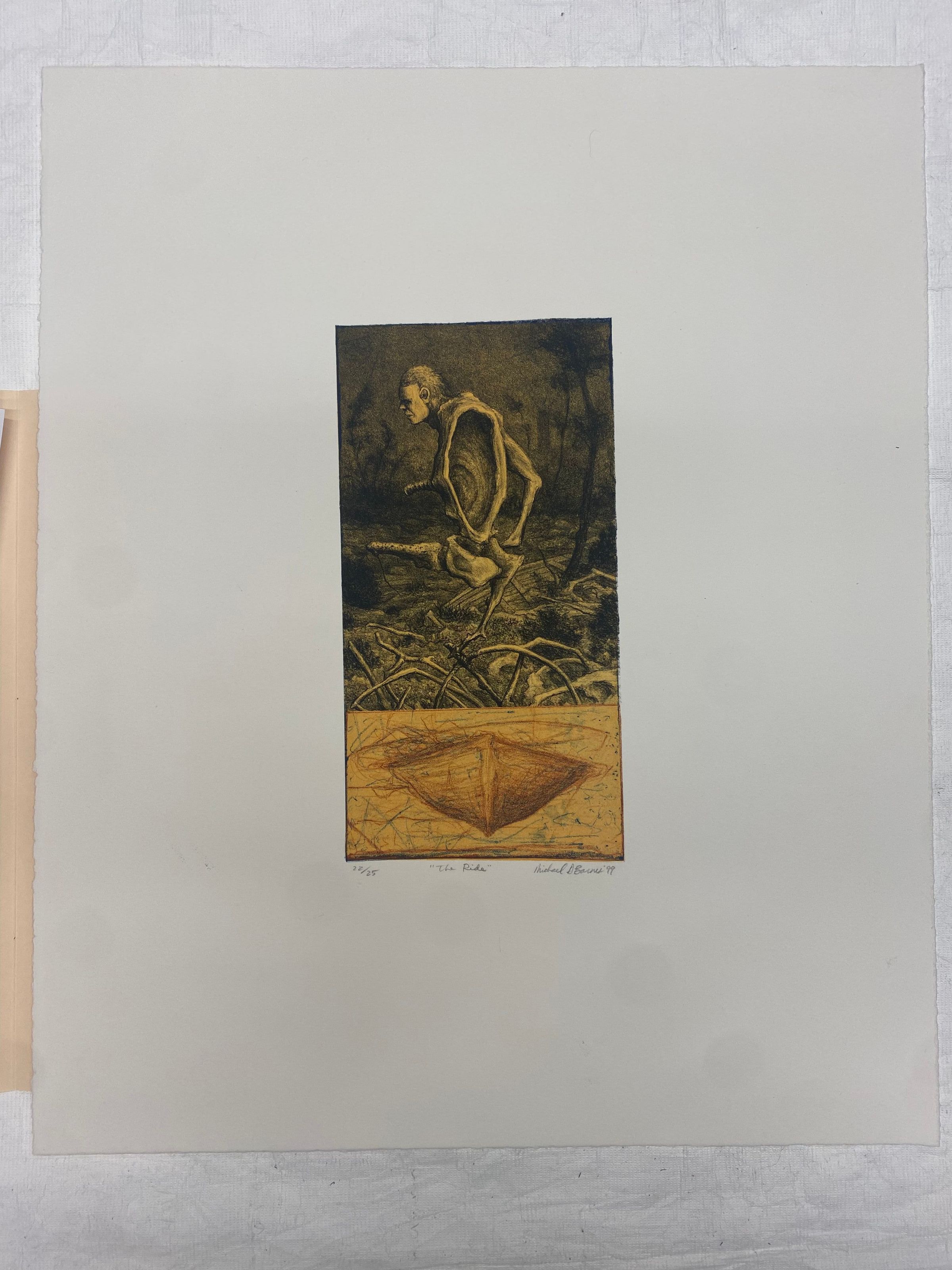 Medium size lithographic print with an anthropomorphic figure made up of bones, sticks, and shells walking through a dark landscape in sepia tones. Directly beneath the scene is a smaller yellow depiction of a buried shell with various markings of small streaks of blue and red.Collection