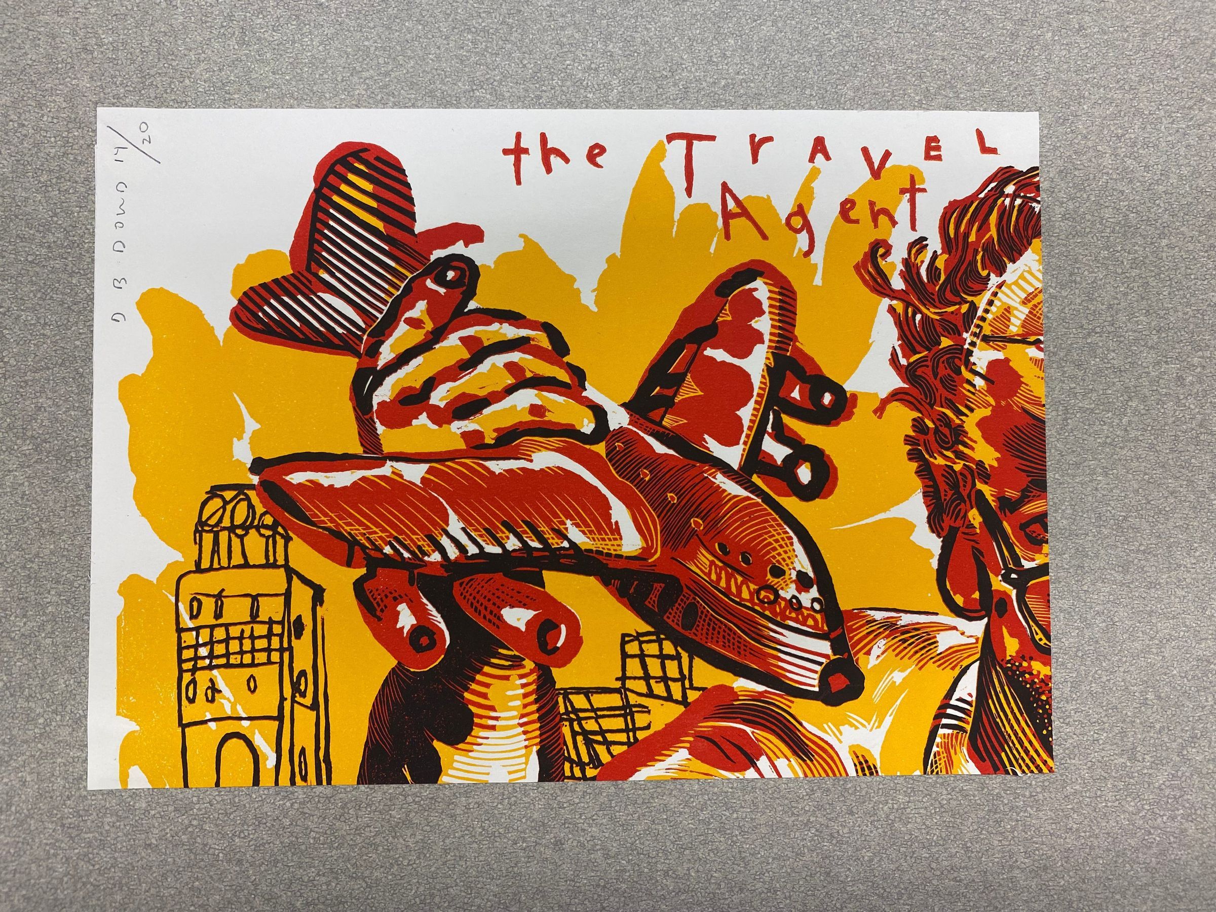 A small horizontally oriented print of an airplane at the central of the composition, being held by a masculine figure wearing a suit and glasses, who is cut off and runs off the right side of the page. Linear abstract lines creating an illusion of a cityscape and skyscrapers are on the background. The words "The Travel Agent" are on top and in-between the airplane and human form.Collection