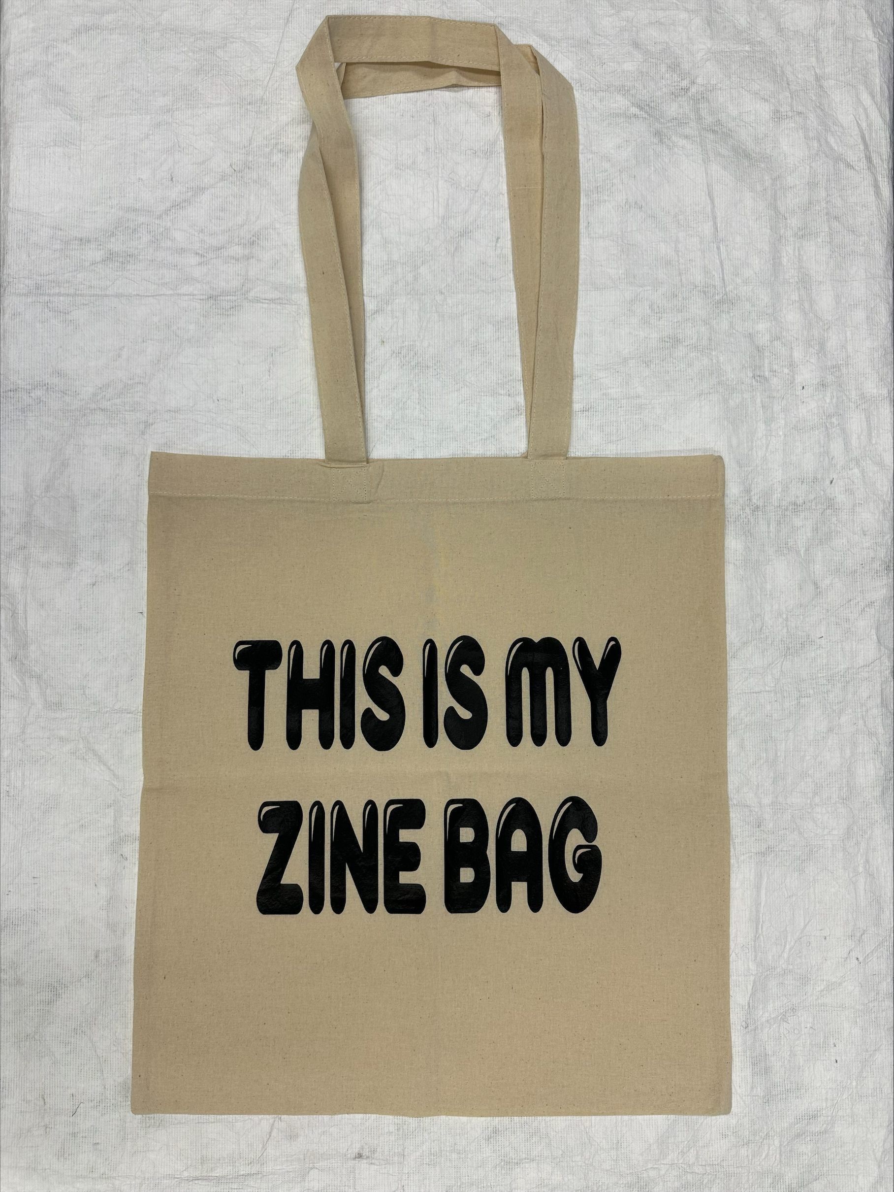 Medium-sized, vertically oriented natural canvas tote bag screen-printed with black pigment, "THIS IS MY ZINE BAG," horizontally across front. Two natural canvas handles attached to top front and top rear of bag.Context