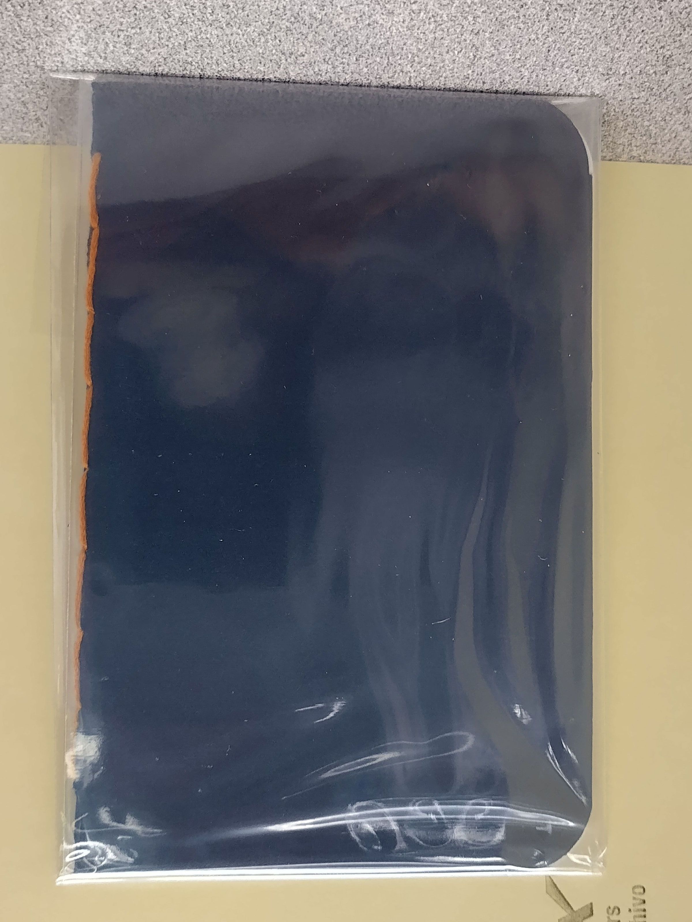 Small navy (dark blue) thick paper booklet with white inner paper sheets thread bound with golden thread. No other details are visible on either cover side.Collection