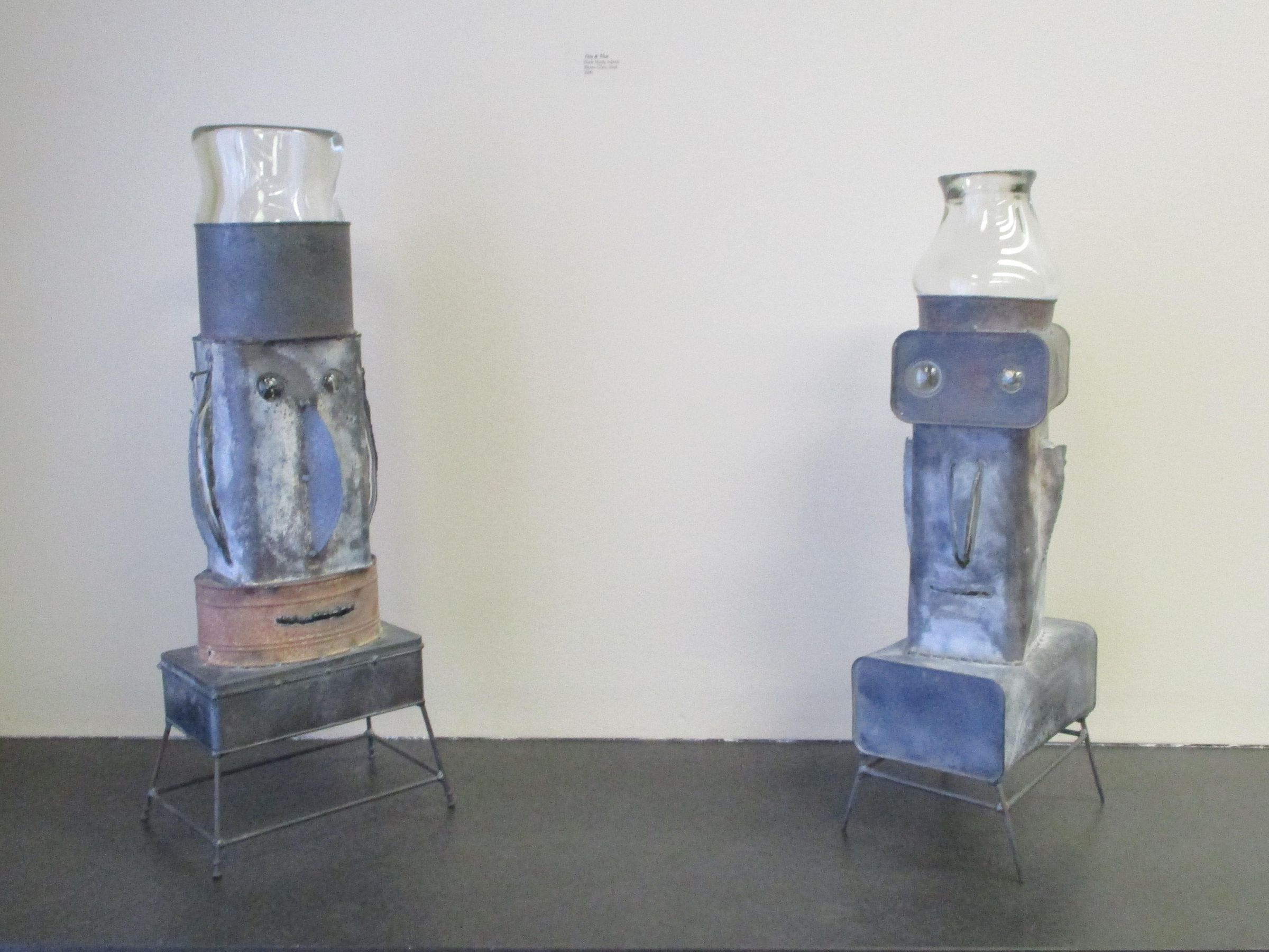 A pair of artworks created from metal and blown glass with facial features.Collection