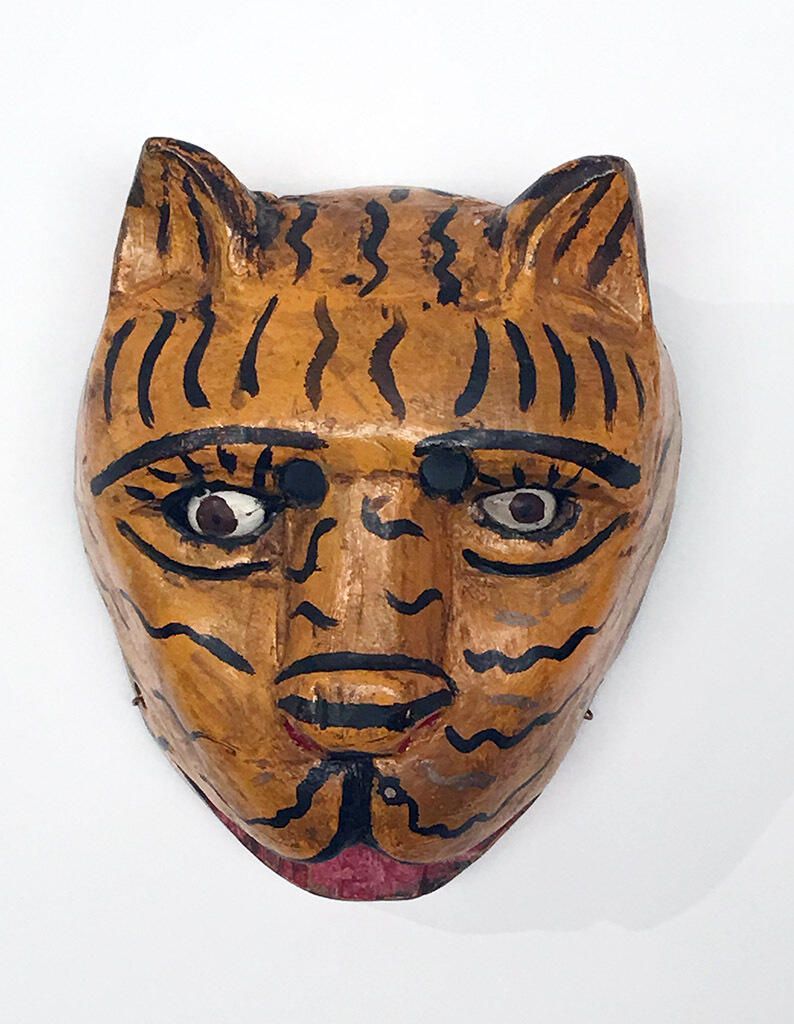 A life-sized triangular wood mask depicting a canary-yellow tiger. Two upright ears protrude from the head. Two cutout eyeholes above inset brown eyes outlined with black lashes. A straight nose is above a slightly open red mouth. The mask is covered with squiggly black lines to mimic tiger stripes. A wire is attached to the back of the mask.Context