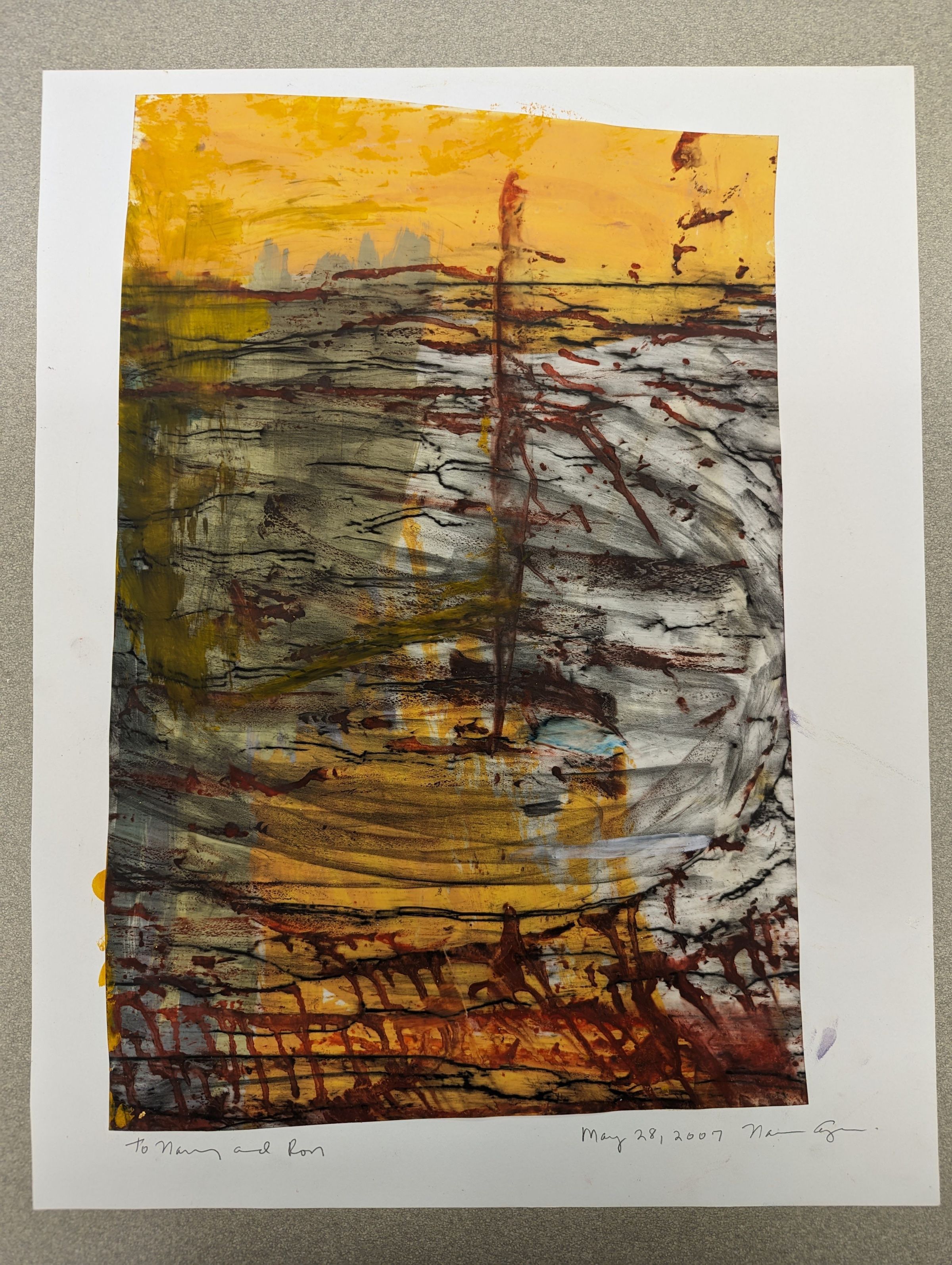 A medium vertically oriented print of an unevenly cut page that is glued to the larger page behind it. It depicts a swirling mix of colors; the orange and yellow background is covered over in arcing grays and ochre, and then increasingly heavy rotating splatters of red pigment.Context