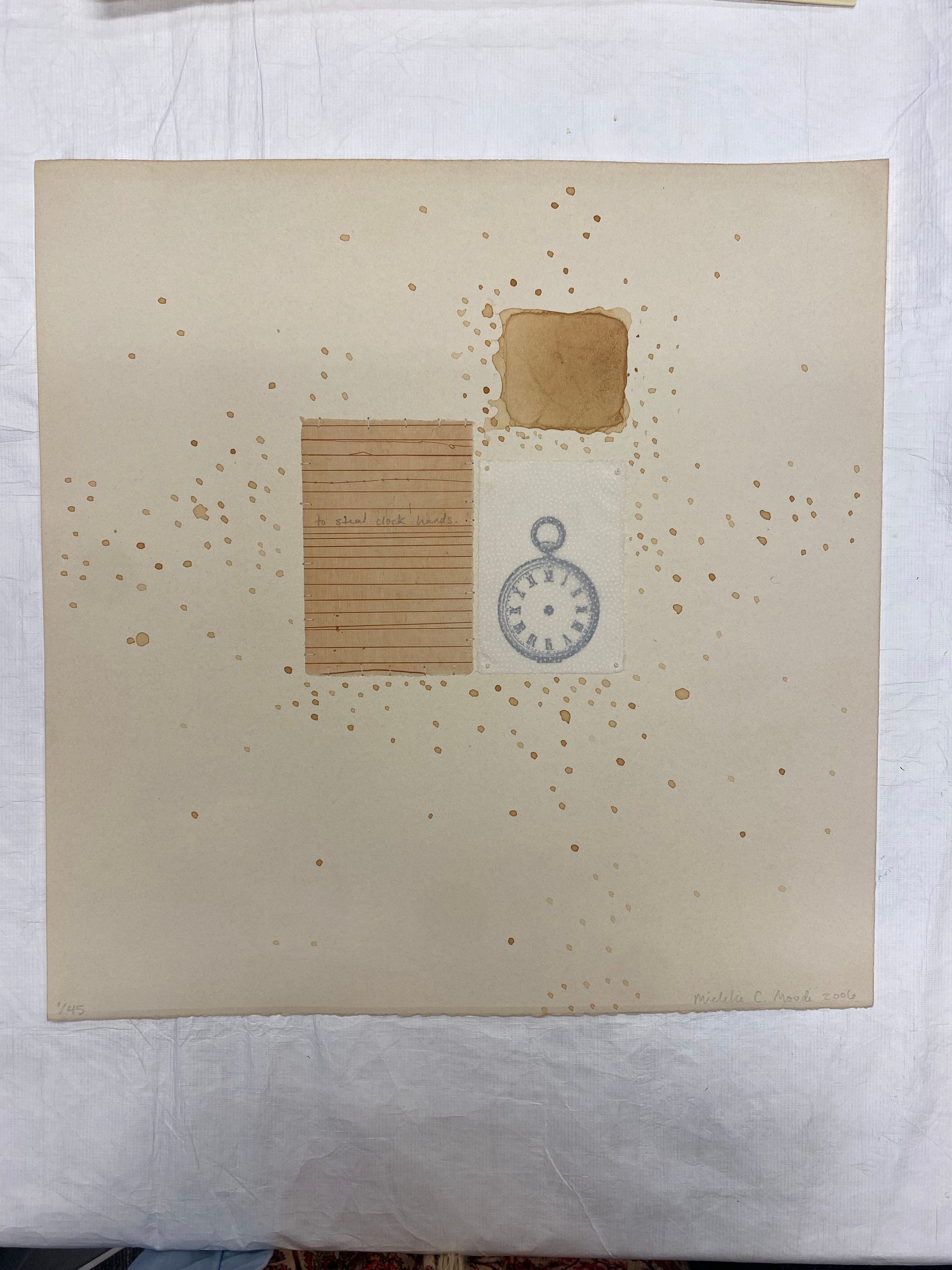 Large square mixed media print combines textile elements, printed image, written text, and applied pigments on cotton rag paper. In the center, there is a printed image of a pocket watch without clock hands, and it is covered with a thin white piece of textile cloth stitched through the page. On the right proper, a small piece of handmade notebook paper is stitched to the page with text written in pencil "To steal clock hands...". Above the pocket watch in the left central space is a solid brown square with rounded edges, from which flecks of brown pigment creates splattered circles reaching the edges of the page.