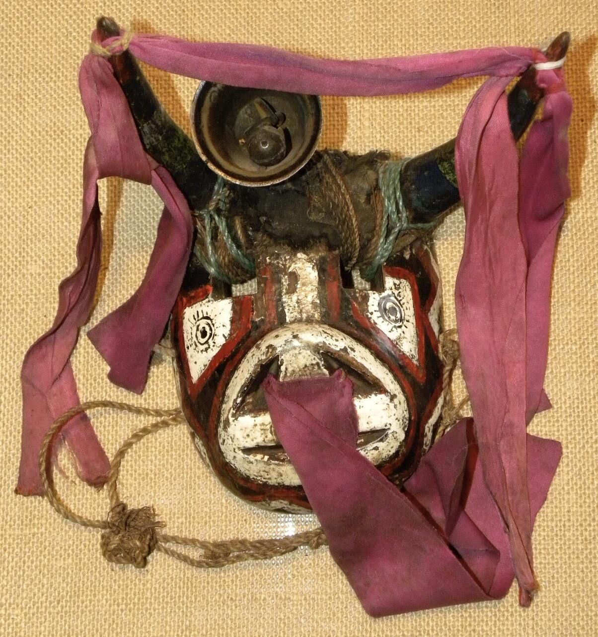 A large square wood mask depicting a stylized, polychrome bull. Two large horns protrude from the forehead and have a metal bell attached with green and brown rope. A purple ribbon is tied between the horns. Two cutout rectangular eyeholes are above black eyes outlined with white and red. The white nose has black nostrils, a black mouth, and a purple ribbon tied between the nostrils. A wire is attached to the back of the mask. Overall signs of pigment loss.Context