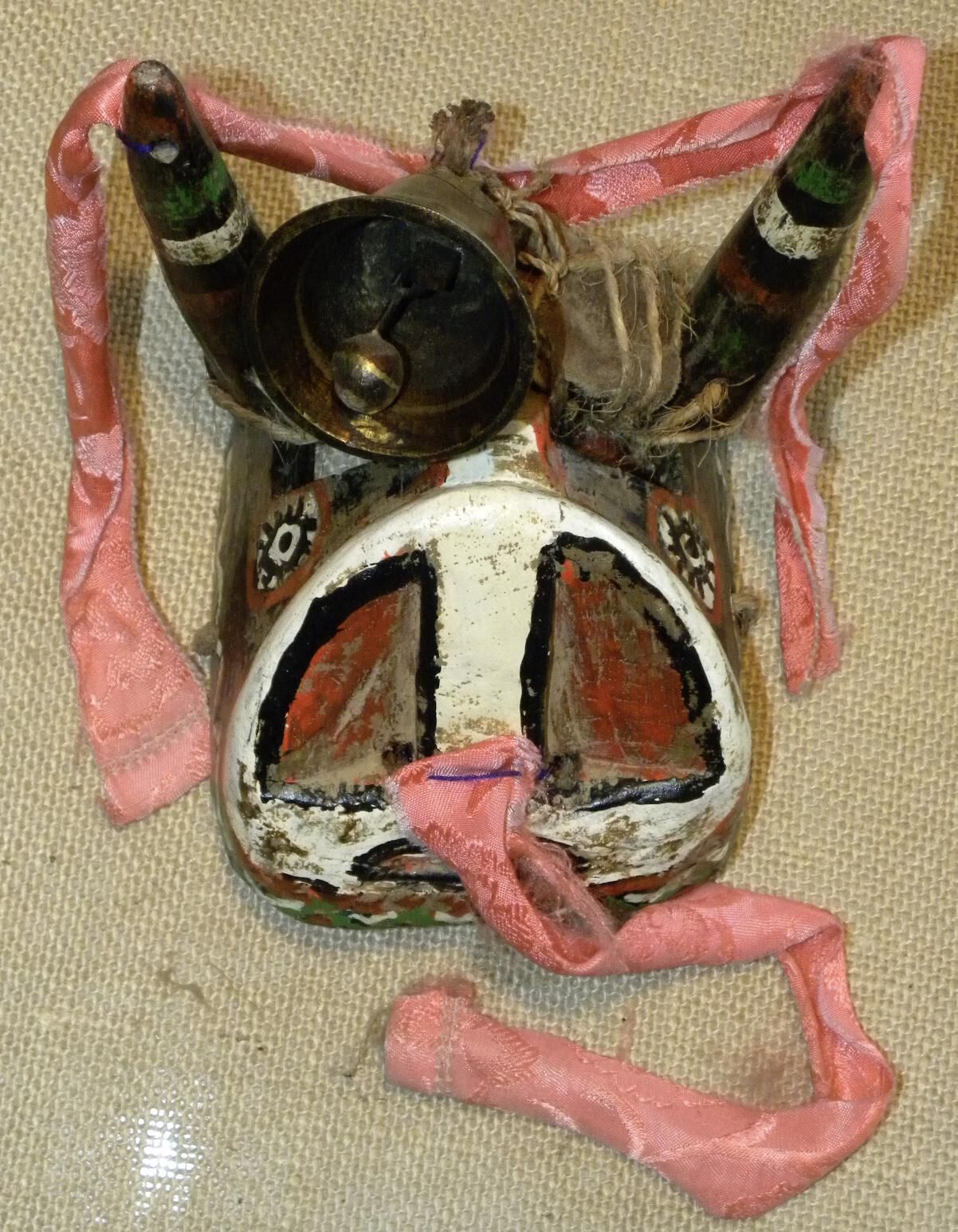A life-sized square wood mask depicting a stylized, polychrome bull. Two large striped horns protrude from the forehead and have a metal bell attached with brown rope. A pink floral ribbon is tied between the horns. Two cutout rectangular eyeholes are above black eyes outlined with white and red. The white nose has red nostrils, a mouth, and a pink floral ribbon tied between the nostrils. A wire is attached to the back of the mask. Overall signs of pigment loss.Context
