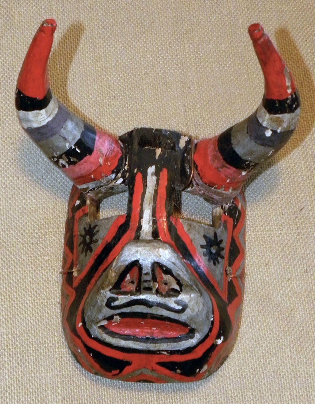 A life-sized rectangular wood mask depicting a stylized, polychrome bull. Two large striped horns protrude from the forehead. Two cutout rectangular eyeholes are above black eyes outlined with silver and red. A silver muzzle has painted black nostrils, a mustache, and an open red mouth. A wire is attached to the black of the mask. Some signs of pigment loss.Context