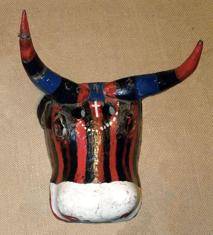 A life-sized rectangular wood mask depicting a decorated bull with a red and black vertically striped face. Two red, black, and blue horns protrude from the top of the head. One animal hide ear is attached next to the right horn. Two carved and painted eyes and two cutout eyeholes for the wearer partially encircled with white dots and with a white cross in between. A white muzzle with red nostrils and open mouth. A wire is attached to the back of the mask. Good condition but some pigment loss on the nose.Context