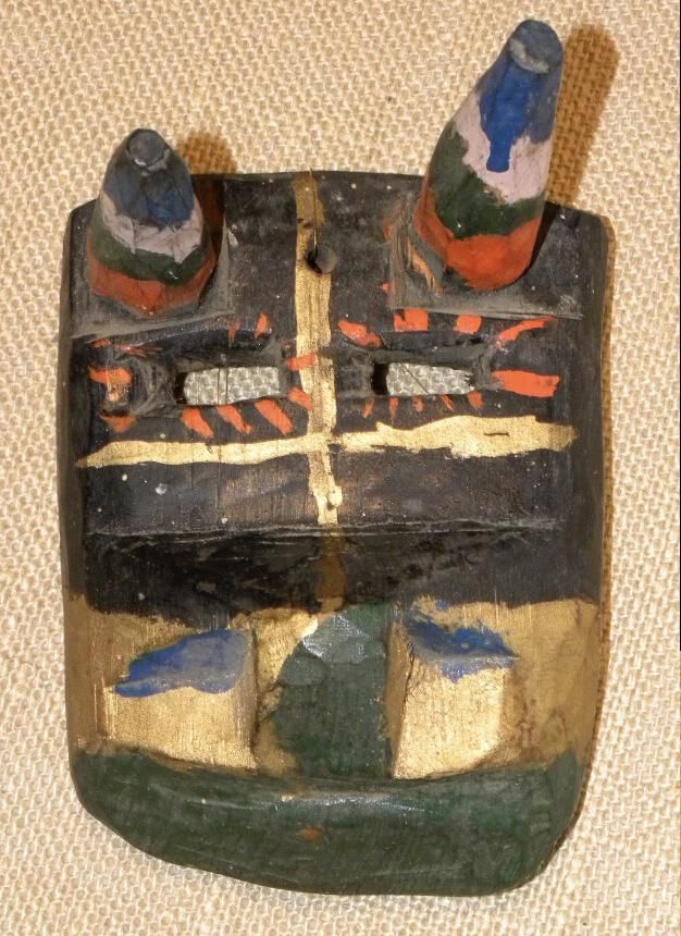 A small rectangular wood mask depicting a stylized, polychrome bull. One short and one long red, green, white, and blue striped horns protrude from the forehead. Two cutout rectangular eyeholes are encircled with thick red lashes. There is a gold cross pattern on the top half of the mask. The nose protrudes from the face and is colored gold with green and blue accents. A wire is attached to the back of the mask. Overall good condition with some signs of pigment loss.Context