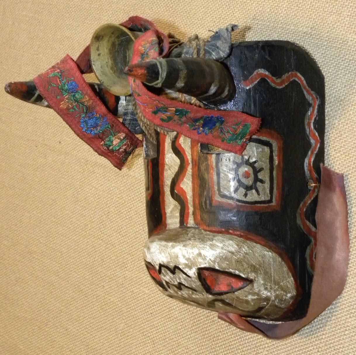 A small rectangular wood mask depicting a stylized, polychrome bull. Two striped horns protrude from the forehead and have a metal bell attached with a red floral ribbon and rope. Two cutout rectangular eyeholes are above silver square eyes outlined with black and red. There is a squiggly red, silver, and black pattern around the mask. The silver nose slightly protrudes from the face and has red nostrils and black accents. A wire is attached to the back of the mask. Some signs of pigment loss.Context