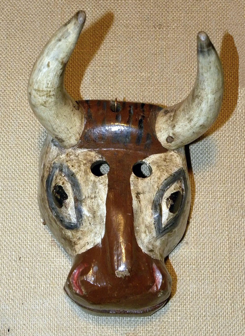 A life-sized rectangular wood mask depicting a pecan-brown bull. Two large white horns extend from the forehead. Two circular cutout eyeholes for the wearer are above large painted eyes set in large white shapes. The brown muzzle has red nostrils and a red mouth. A wire is attached to the back of the mask. Overall signs of pigment loss.Context