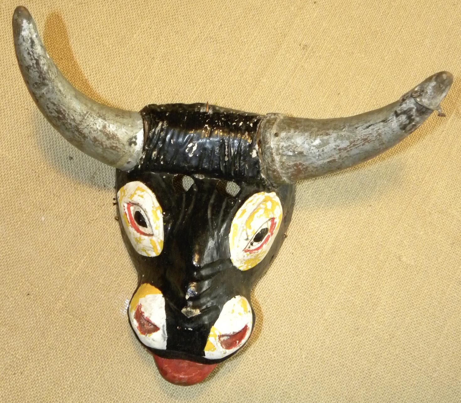 A medium triangular wood mask depicting a black bull with large silver horns. Circular cutout eyeholes are above painted black eyes outlined with red and set in large white ovals. The muzzle has two red nostrils set in large white ovals, a yellow chin, and an open red mouth with the tongue sticking out. A wire is attached to the back of the mask. Some signs of pigment loss.Context