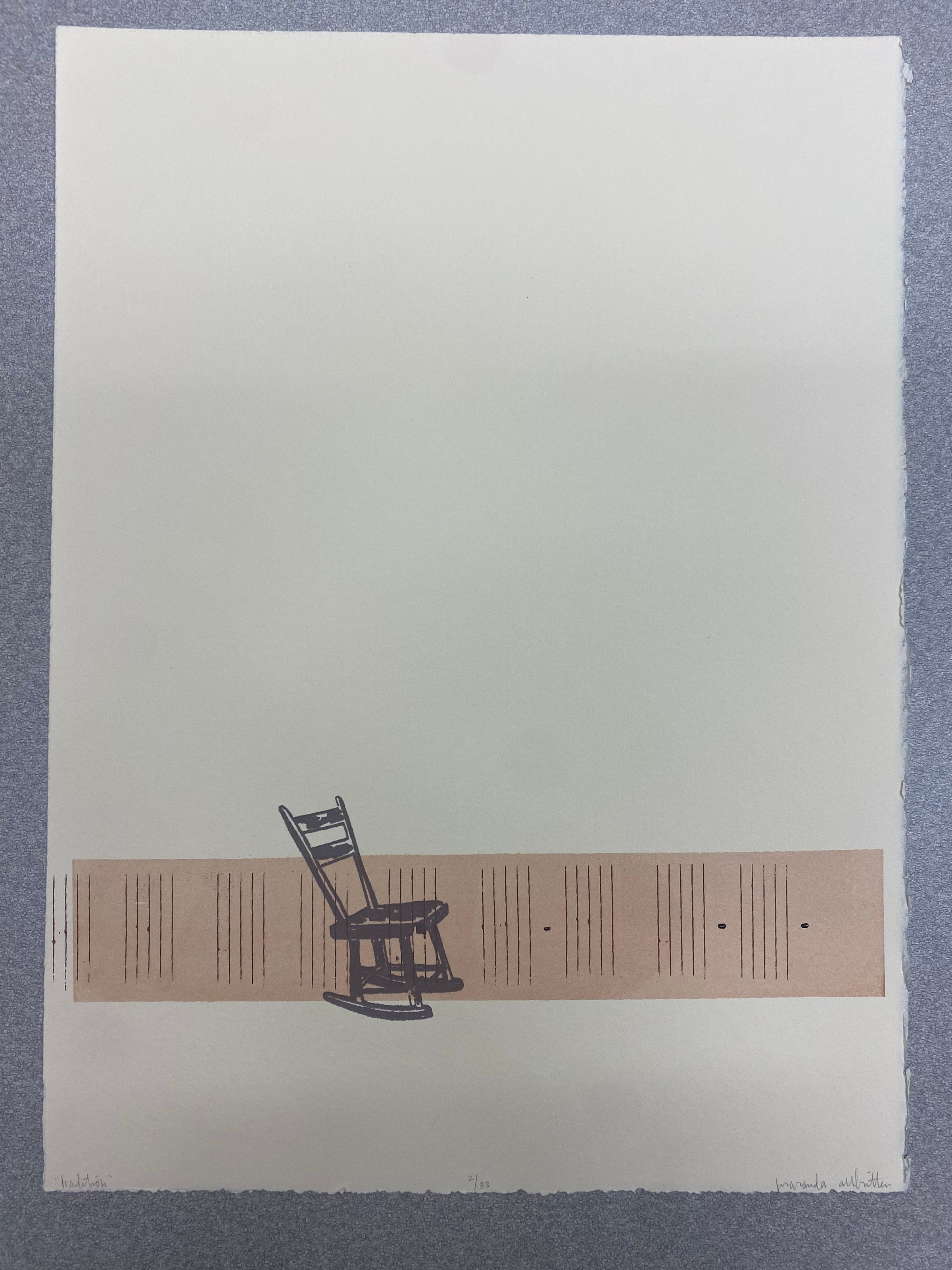 A medium vertically oriented print on an ivory tone paper which also serves as the background. The main composition of the prints in on the lower portion, consisting of a rocking chair that faces right, inside a beige tone rectangle. The rectangle contains nine groups of vertical lines with an assortment of dots.Collection